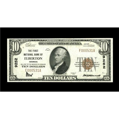 <B>Elberton, GA</B></I> - $10 1929 Ty. 1 <B>The First NB</B></I> Ch. # 9252<BR>This bright note which carries an interesting signature from the cashier resembling a tornado on its side is a light fold from Gem. <B>Choice About Uncirculated</B></I>.