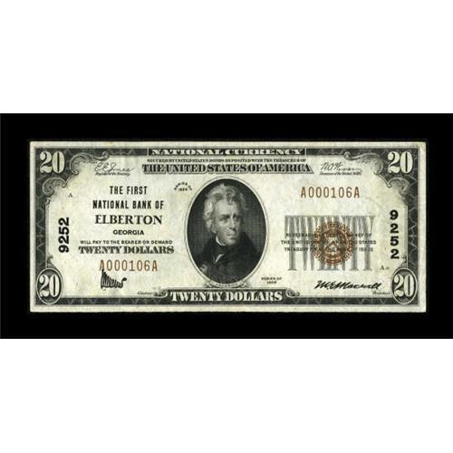 <B>Elberton, GA</B></I> - $20 1929 Ty. 1 <B>The First NB</B></I> Ch. # 9252<BR> Cashier H.P. Hunter's signature has been best described as a "tornado on its side," while president M.E. Maxwell has a legible signature. <B>Extremely Fine</B></I>.<BR><I>From The Amelia Island Collection.</B></I><BR><BR><b>Shipping:</b> Coins & Currency (<a target="_blank" href="http://www.heritageauctions.com/common/shipping.php">view shipping information</a>)