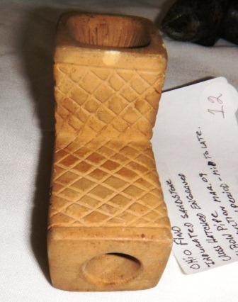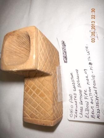 Elbow Style Pipe crosshatched, engraved made of indurated sandstone, Mississippian era. Measures approximately 3 1/2 by 1 1/2 by 2 1/4 inches. There are small chips. Shipping 15.00