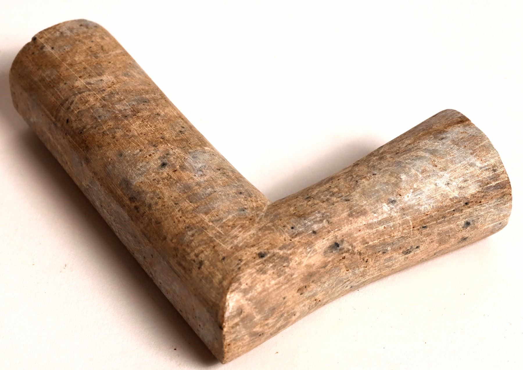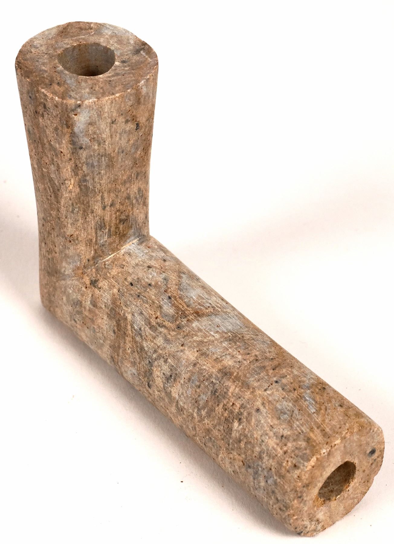 This pipestone bowl is of soapstone at 4 in. X 3 in. X 1 in. It is gray in color and shaped in an"L".
