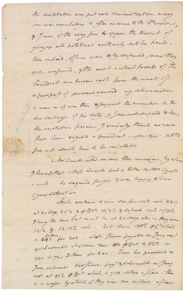 Signer of the Declaration of Independence from Massachusetts (1744–1814) who later served as vice president under James Madison. His name entered the language as a result of his support of politically advantageous redistricting, which became known as ‘gerrymandering.’ Partial ALS signed “E. Gerry,” three pages on two adjoining sheets, 8 x 12.75, [docketed January 16, 1792]. The concluding pages of a longer letter, in part: "General Knox wishing to see me desired by a messenger I would call on him as I went to Congress; & being informed of my indisposition & that it prevented a compliance with his request, he called on me, recognized his obligations for bringing him on to his present office & entered into a confidential conversation respecting the justice policy & military operations of the present war & the clamor against it—it was a subject I well understood & I stated to him my ideas of the causes, justice & necessity of the war, of the wise conduct of the president in every respect, of the judicious measures of the War department & of the errors thereof, & of the misfortunes & defects of the military operations. I was also explicit in my ideas of what ought to be done as well to satisfy the public mind & give it a just idea of measures, as for the further prosecution & termination of the war. He listened with evident mark of great satisfaction & expressed a reliance in me to support the execution by bringing forward motions adapted to this purpose. I am happy it is in my power to do it on principles of honor; for I never will submit to the prostituted office of varnishing the fault or follies of any man however exalted powerful or popular. But it is remarkable that General Knox should place this confidence in me solely, which he declared was the case, there not being another member of either house, as he said to whom he had thus committed himself, seeing that when the constitution was put into administration every one was emulating to offer income to the President, & I was of the very few to oppose the torrent of giving up all political authority into his hands, then indeed, offices were to be conferred, now they are conferred, & the most violent friends of the President are become cool from the want of a prospect of personal reward. My determination is now as it was then to support the executive in the due discharge of his duty, & I am well disposed to keep this resolution, because I seriously think we never shall have so good a president in after this, altho I do not admit him to be infallible.