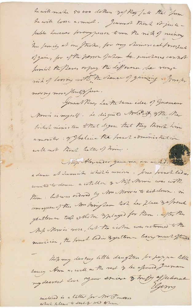 Mr. Lowell called on me this morning, by whom I learned that Miss Lowell's foot is better & Mrs. Lowell is well. He enquired for you & was happy to hear of your situation. Stocks continue to rise six per cent cash 24/9 at 60 days 25/4 3 p Cent 15/3% & deferred cash 15/11% I fancy the two last must be at 60 days also—they were 14/6 & 14/11% cash. Half shares 120% & 62 which is 441 Dollars for 200. Whole shares payable in Jany next & deleverable at ye same time -80 p Cent to 82% or 720 to 730 Dollars for 400. Duer has purchased as I am informed 500 shares paya & deleverable in Jany next at 87% p Cent which is 750 dollars a share. There is a wager by which if they rise 100 dollars a share he will make 50000 dollars & if they fall the sum he will loose as much. I cannot think it justifiable however for any person to run the risk of ruining his family at one stroke, for any chimerical prospects of a gain, for of the person of whom he purchases cannot punish the slaves or pay the difference, he runs a risk of loosing with out the chance of gaining. I prefer moving more slowly & sure. General Knox has the same idea of Gouverneur Morris as myself. He disgusted Mr. Pitt & the other British ministers to that degree that they think him a monster: & I believe the French administration will not think better of him. Miss Alexander gave me an a dance at which is curious. Some French ladies wanted to dance a cotillon & Miss Morris was with them: but was ordered by Mrs. Morris to sit down. In consequence of this Mrs. Bingham took her place & a French gentleman took ye violin & played for them after this Miss Morris rose, but the violin was returned to the musician, the French ladies & gentlemen being much offended." In fine condition, with separations along the hinge and a few small areas of paper loss to the last page.
