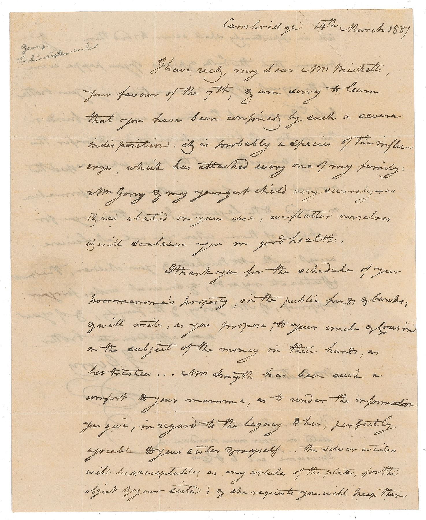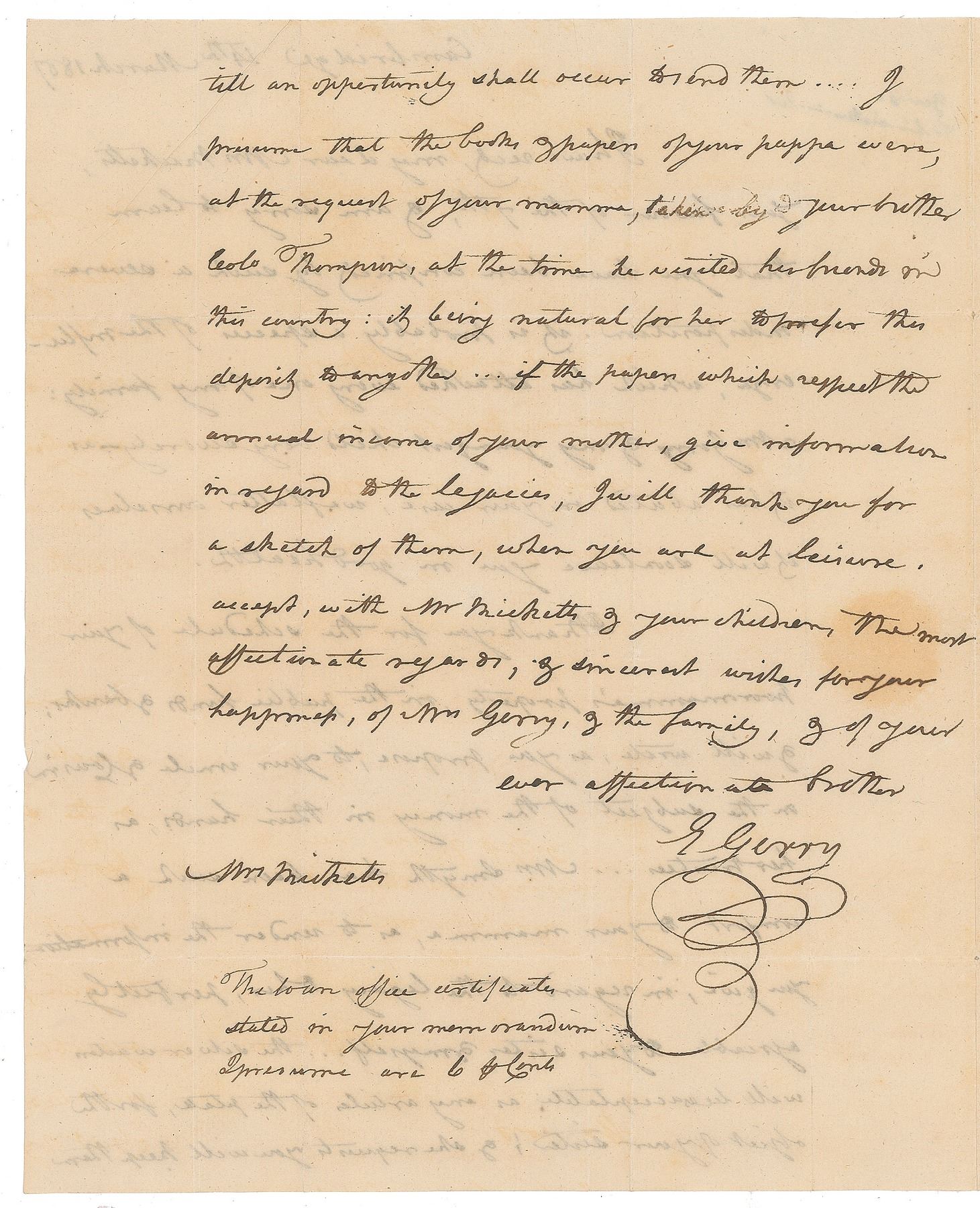 ALS signed “E. Gerry,” one page both sides, 7.25 x 9, March 14, 1807. Letter to his sister-in-law Mary Ricketts, settling the estate of his mother-in-law. In part: "Am sorry to learn that you have been confined by such a severe indisposition. It is probably a species of the influenza, which has attacked every one of my family: Mrs. Gerry & my youngest child very severely—as it has abated in your case, we flatter ourselves it will soon leave you in good health. I thank you for the schedule of your poor mamma's property, in the public funds & banks; & will write, as you propose, to your uncle & cousin on the subject of the money in their hands, as her trustees…I presume that the books & papers of your pappa were, at the request of your mamma, taken by your brother, Col. Thompson…If the papers which respect the annual income…give any information in regard to the legacies, I will thank you for a sketch of them, when you are at leisure." In fine condition, with seal-related paper loss to the integral address leaf. Provenance: The Malcolm S. Forbes Collection of American Historical Documents, Christie's, November 2, 2006.