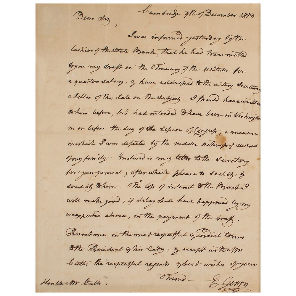 ALS as vice president, signed "E. Gerry," one page, 7.25 x 9.5, December 9, 1813. Letter to President Madison's brother-in-law, Richard Cutts, who had recently been named Superintendent General of Military Stores. In part: "I was informed yesterday by the Cashier of the State Bank, that he had transmitted to you my draft on the Treasury of the UStates for a quarter salary. I have addressed to the acting Secretary a letter of this date on the subject. I should have written to him before, but had intended to have been in Washington on or before the day of the Session of Congress; a measure in which I was defeated by the sudden sickness of several of my family. Enclosed is my letter to the Secretary for your perusal; after which please to seal it, & send it to him. The loss of interest to the Bank I will make good, if delay shall have happened by my unexpected absence, in the payment of the draft. Present me in the most respectful & cordial terms to the President & his Lady." Matted and framed with an engraved portrait to an overall size of 15.75 x 13.75. In fine condition, with a few small stains.