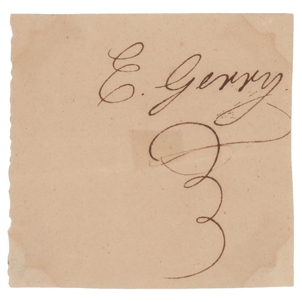 Ink signature, "E. Gerry," with an elaborate paraph on an off-white 2.75 x 2.72 slip, clipped from a larger document. In fine condition, with mild overall toning, and light show-through from a small piece of tape on the back. In his 1995 reference History Comes to Life, Kenneth Rendell places Gerry's autograph material into the 'rare' category among the Signers.