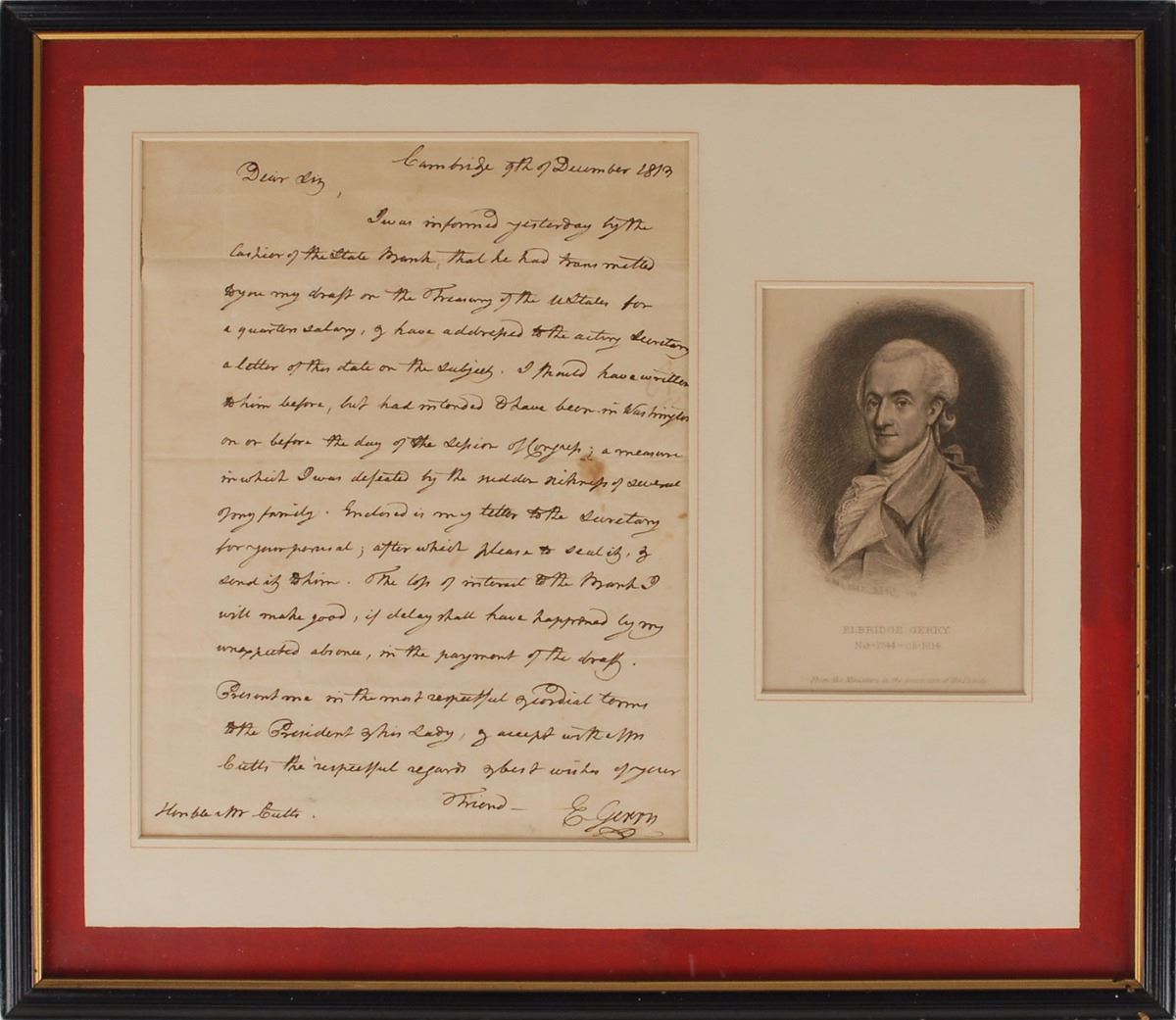 Signer of the Declaration of Independence from Massachusetts (1744–1814) who later served as vice president under James Madison. His name entered the language as a result of his support of politically advantageous redistricting, which became known as ‘gerrymandering.’ ALS as vice president, signed “E. Gerry,” one page, 7.25 x 9.5, December 9, 1813. Letter to Richard Cutts, who had recently been named Superintendent General of Military Stores. In part: “I was informed yesterday by the Cashier of the State Bank, that he had transmitted to you my draft on the Treasury of the UStates for a quarter salary. I have addressed to the acting Secretary a letter of this date on the subject. I should have written to him before, but had intended to have been in Washington on or before the day of the Session of Congress; a measure in which I was defeated by the sudden sickness of several of my family. Enclosed is my letter to the Secretary for your perusal; after which please to seal it, & send it to him. The loss of interest to the Bank I will make good, if delay shall have happened by my unexpected absence, in the payment of the draft. Present me in the most respectful & cordial terms to the President & his Lady.” Matted and framed with an engraved portrait. In fine condition, with a few small stains.