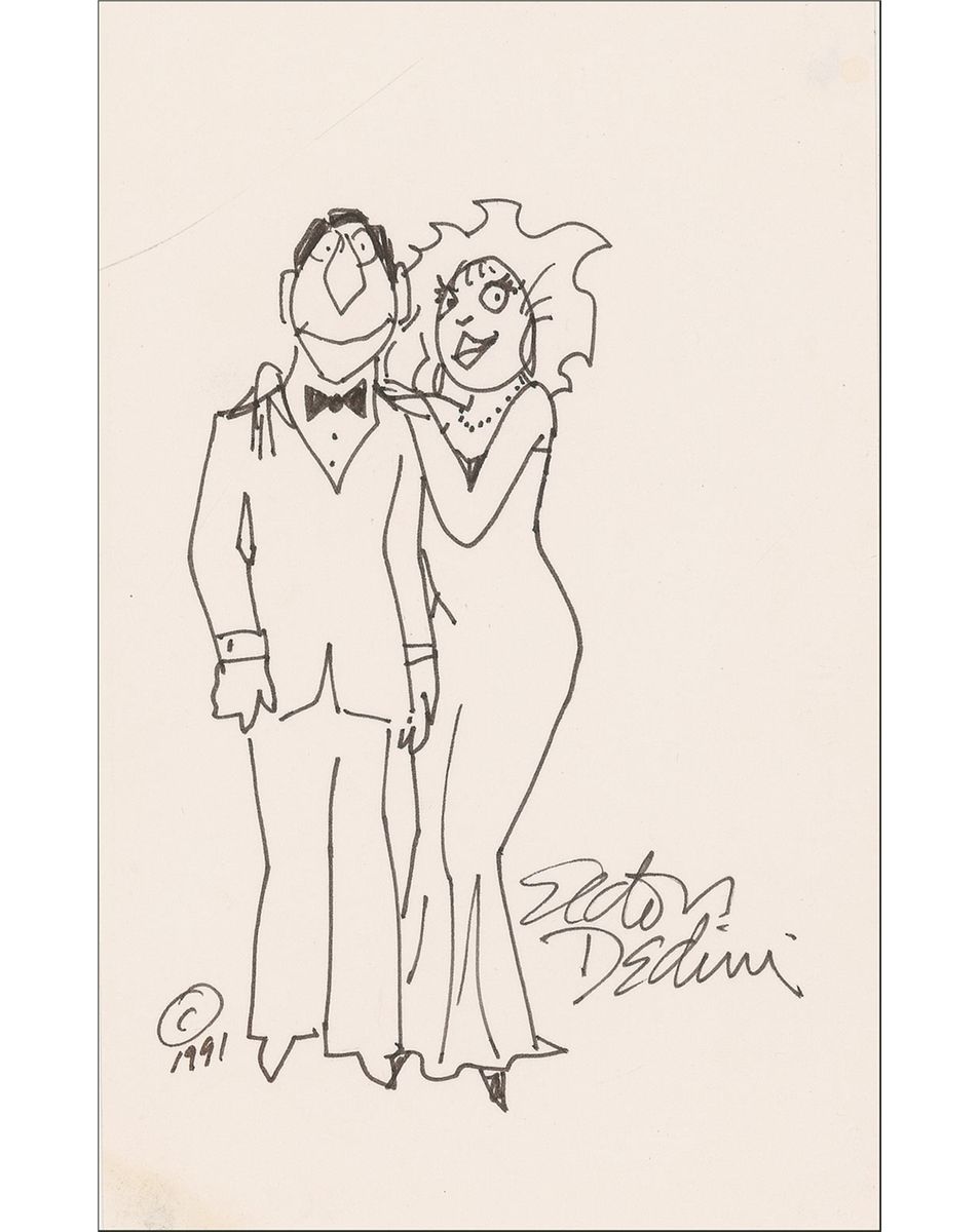 Original felt tip sketch of a man in a tuxedo accompanied by a woman in an evening gown on an off-white 5 x 8 sheet, signed in black felt tip, “Eldon Dedini,” adding the copyright symbol and “1991.” In fine condition, with a light area of toning to the bottom left corner.