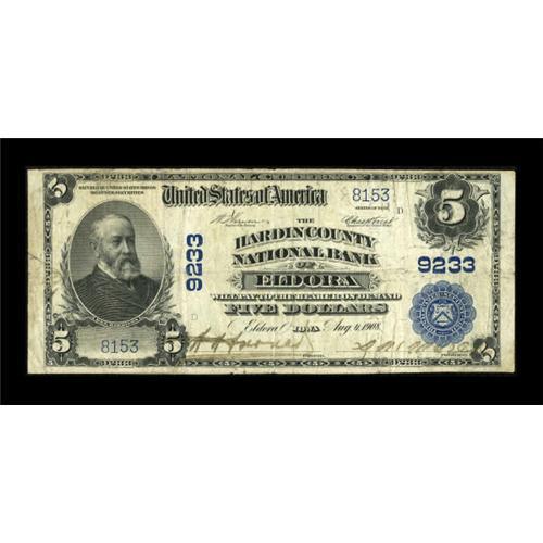 <B>Eldora, IA</B></I> - $5 1902 Plain Back Fr. 600 <B>The Hardin County NB</B></I> Ch. # 9233<BR> The folds are commensurate of a VF grade, though the paper is a little too limp for the full grade. The signatures are bold and the paper is still bright. <B>Fine-Very Fine.</B></I><BR><BR><b>Shipping:</b> Coins & Currency (<a target="_blank" href="http://www.heritageauctions.com/common/shipping.php">view shipping information</a>)