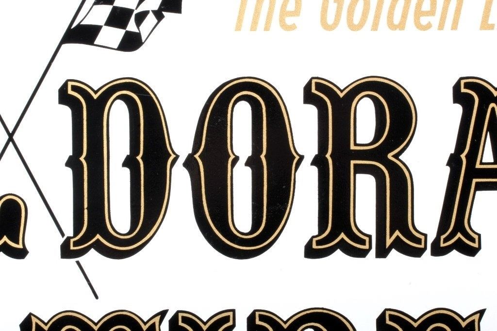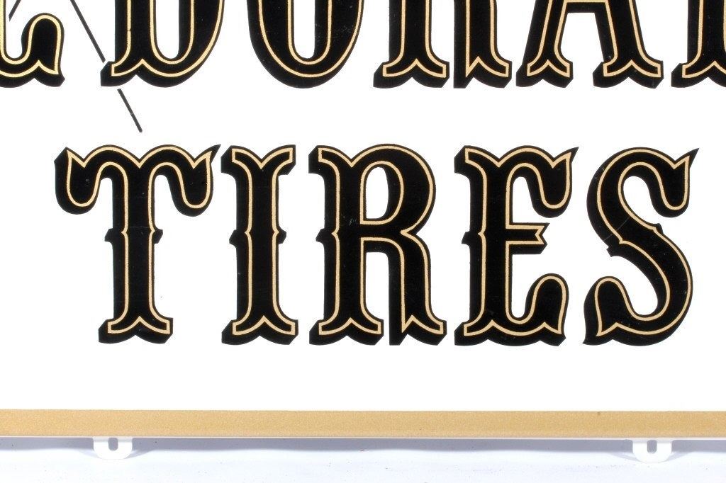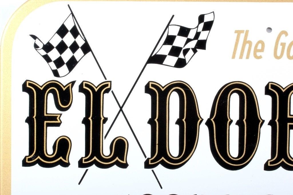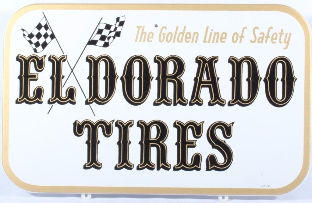 This is an original metal painted advertising sign for Eldorado Tires and is from 1967. The sign was found by the owner new old stock in the packing and is in mint condition. Front reads, "The Golden Line of Safety El Dorado Tires". The sign has the rare double checkered flags with rich gold white and black coloring. Rare sign marked in the bottom corner "A-M 3-67". Has lipped edge and bottom two mounted tabs. Measures 15.25"x23.75" and 3/8" deep.