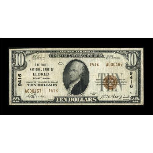 <B>Eldred, PA</B></I> - $10 1929 Ty. 2 <B>The First NB</B></I> Ch. # 9416<BR> An attractive and wholly original note. <B>Fine-Very Fine.</B></I><BR><BR><b>Shipping:</b> Coins & Currency (<a target="_blank" href="http://www.heritageauctions.com/common/shipping.php">view shipping information</a>)