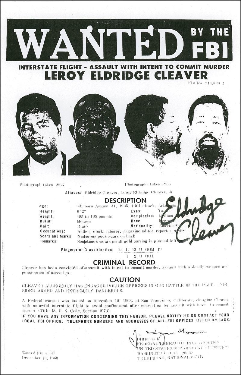 Political activist and leader of the Black Panther Party. He became a political radical with his best selling Soul on Ice, an autobiographical manual of black rage against a white dominated society that inspired the black power movement. Photocopied FBI Wanted poster, 11 x 17, originally issued on December 13, 1968, with four images of Cleaver at the top, descriptions of his crimes, record, and warnings, signed in black felt tip. In fine condition, with some light haloing to signature. RRAuction COA.