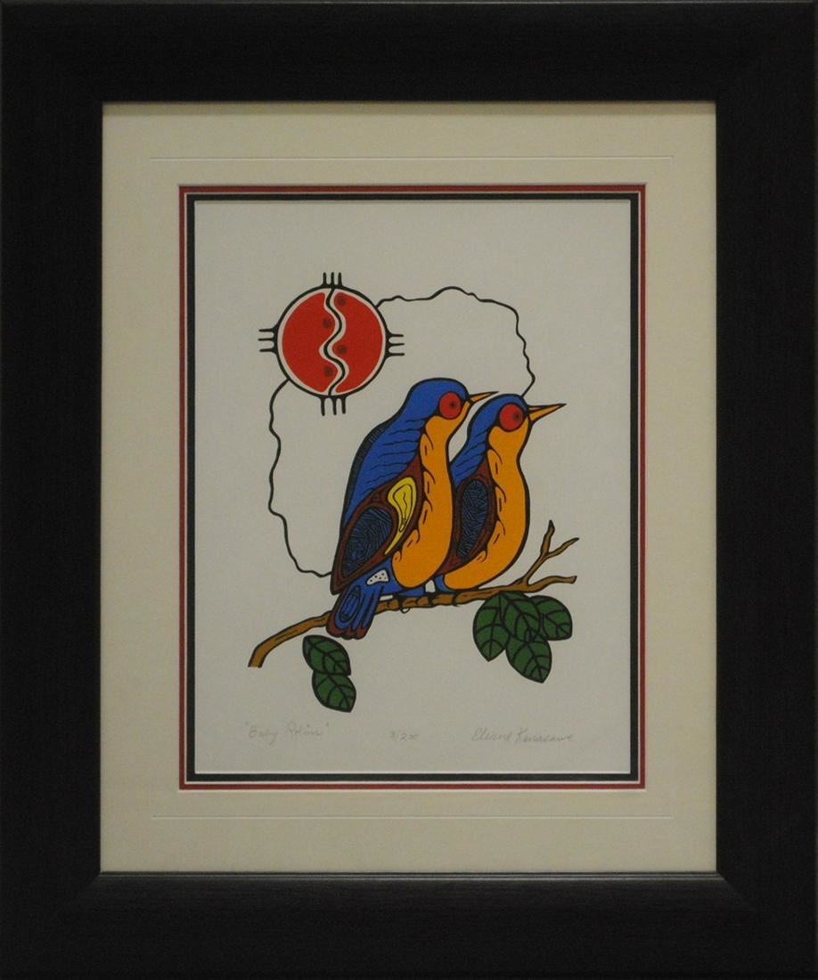 Eleanor K's "Baby Robins" limited edition print signed and numbered 3/230. This has been professionally triple matted using acid free matting and acid free foam core, and has been custom framed under glass. Image- 14 1/2" x 11". Frame- 25" x 21"