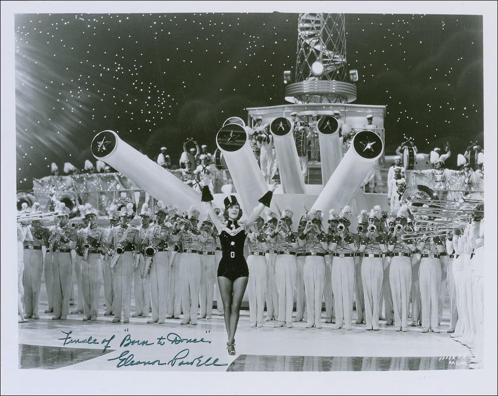 Glossy 10 x 8 photo from Born to Dance, signed in black felt tip, “Finale of ‘Born to Dance, Eleanor Powell.” In fine condition, with some scattered light creases and surface marks.