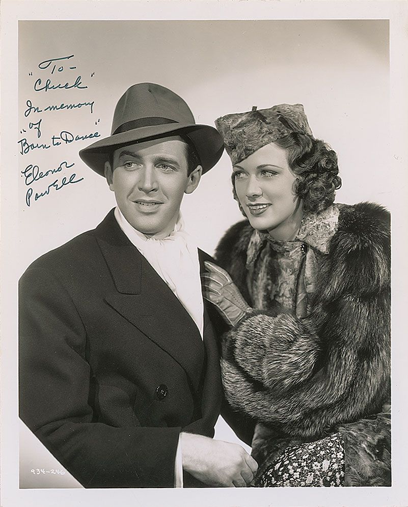 Glossy 8 x 10 photo of Powell and Born to Dance co-star James Stewart, signed and inscribed in black felt tip “To ‘Chuck’ In memory of ‘Born to Dance’ Eleanor Powell.” In fine condition.