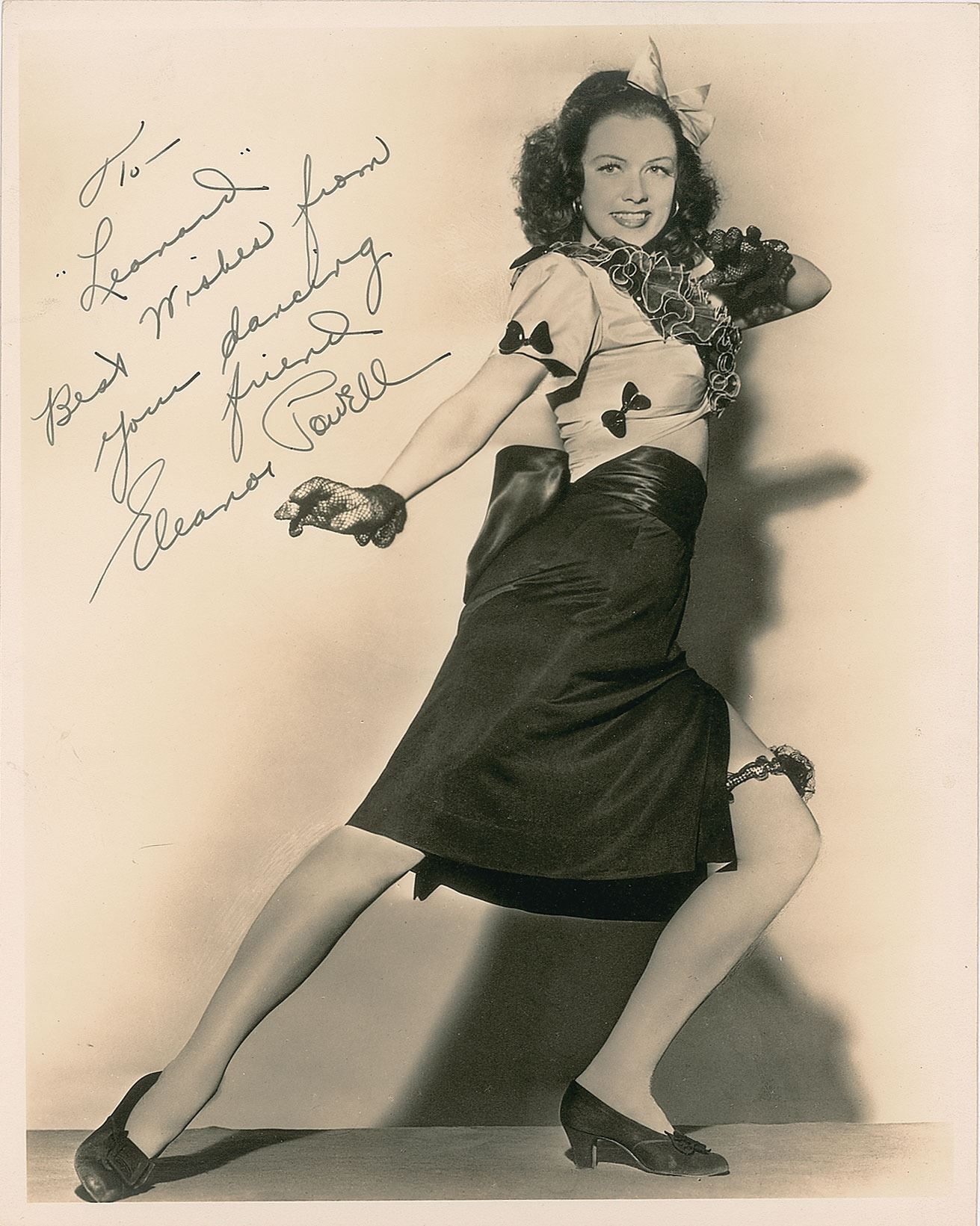 Vintage matte-finish 8 x 10 full-length photo of Powell in costume, signed and inscribed in fountain pen, "To—'Leonard,' Best Wishes from your dancing friend, Eleanor Powell.” In fine condition.