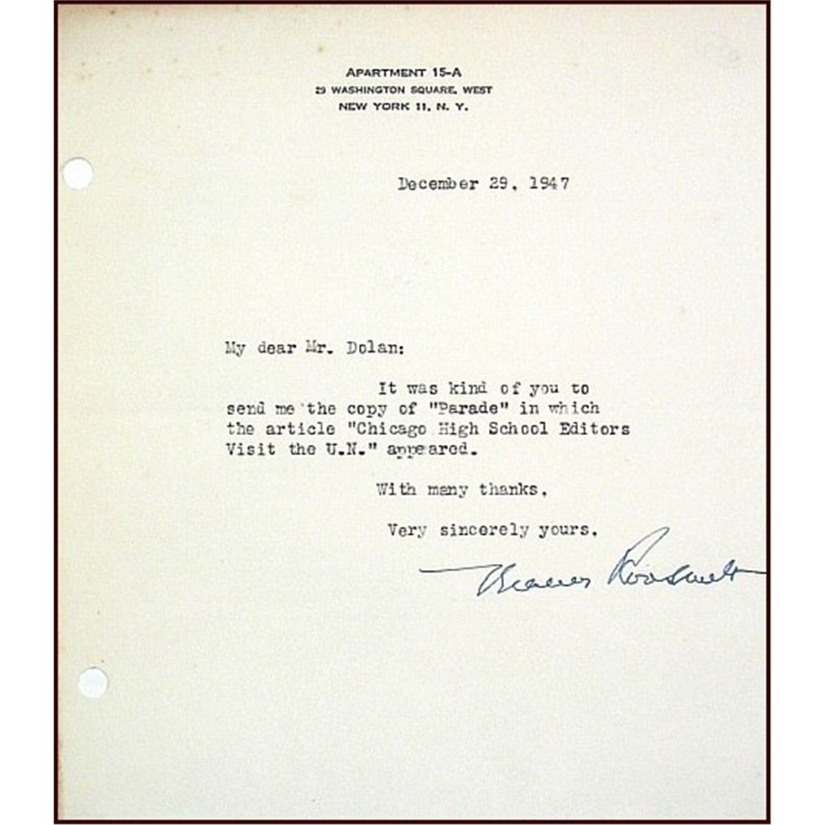 Eleanor Roosevelt 1947 Signed Thank You Letter -- 6'' x 7'' -- Very Good Condition