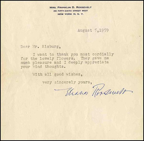 Eleanor Roosevelt TLS signed on her personal stationery, dated 5 August 1959. Roosevelt writes in full: ''Dear Mrs. Kisburg, I want to thank you most cordially for the lovely flowers. They gave me much pleasure and I deeply appreciate your kind thoughts. With all good wishes, Eleanor Roosevelt.'' Measures 7'' x 7''. Mailing crease across middle of letter (more visible on back than on front), otherwise in good condition.