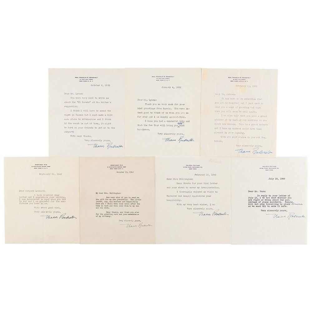 Group of seven TLSs by Eleanor Roosevelt, each one page, 6 x 7, dated from 1945 to 1961. Roosevelt writes to various recipients, sending thanks for "the gift for my new grandchild," writing on her travels and schedule, observing that "people will not stop travelling by plane so we must try to make it safe," sending thanks for "greetings from Russia," and thanking a correspondent for being "a great admirer of my husband…I know my husband would have been pleased by your loyalty." In overall fine condition, with light staining to the 1961 letter.
