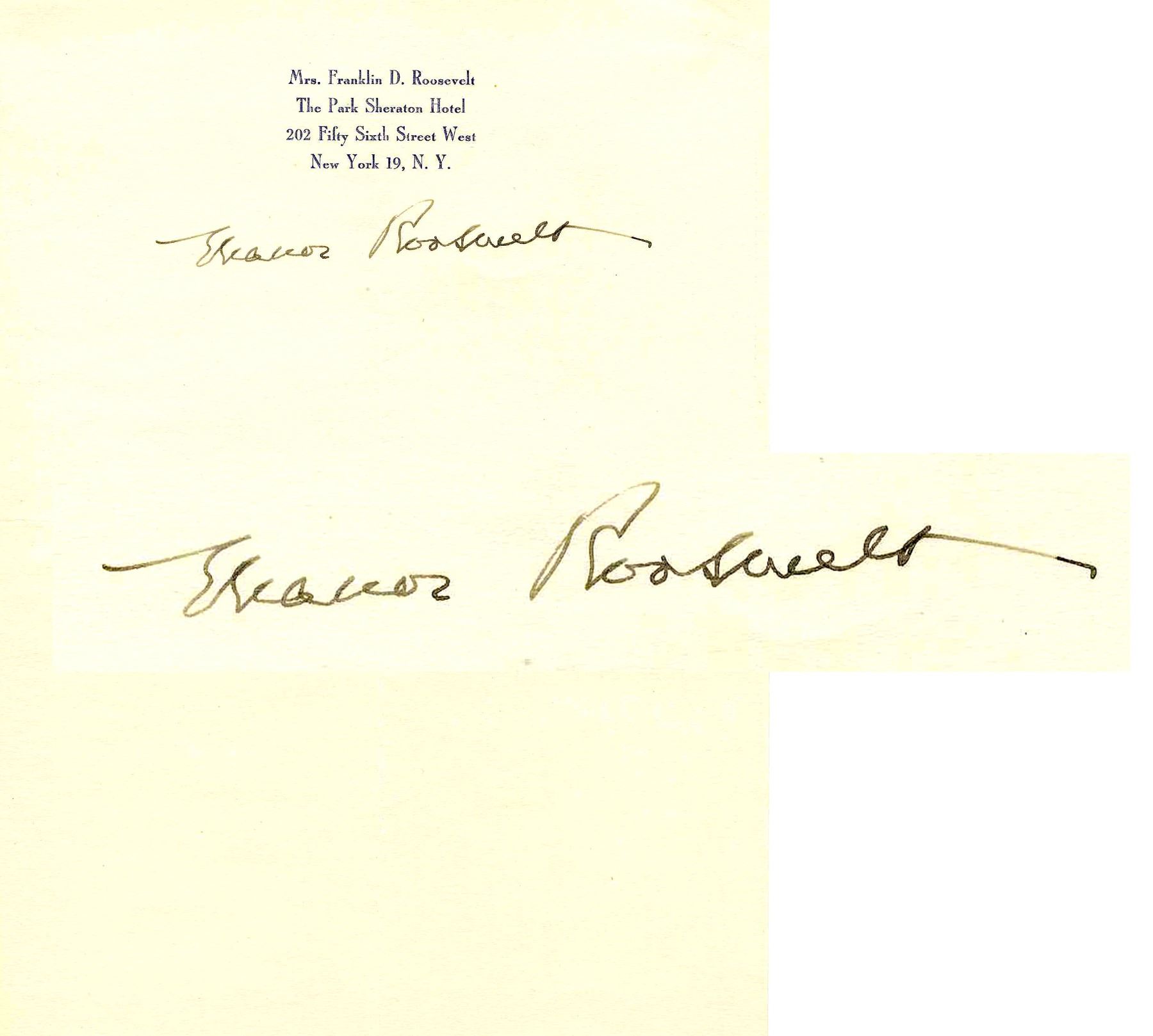 Signature of First Lady Eleanor Roosevelt, written on her personal ''Mrs. Franklin D. Roosevelt'' letterhead from The Park Sheraton Hotel in New York. Folds, else near fine.