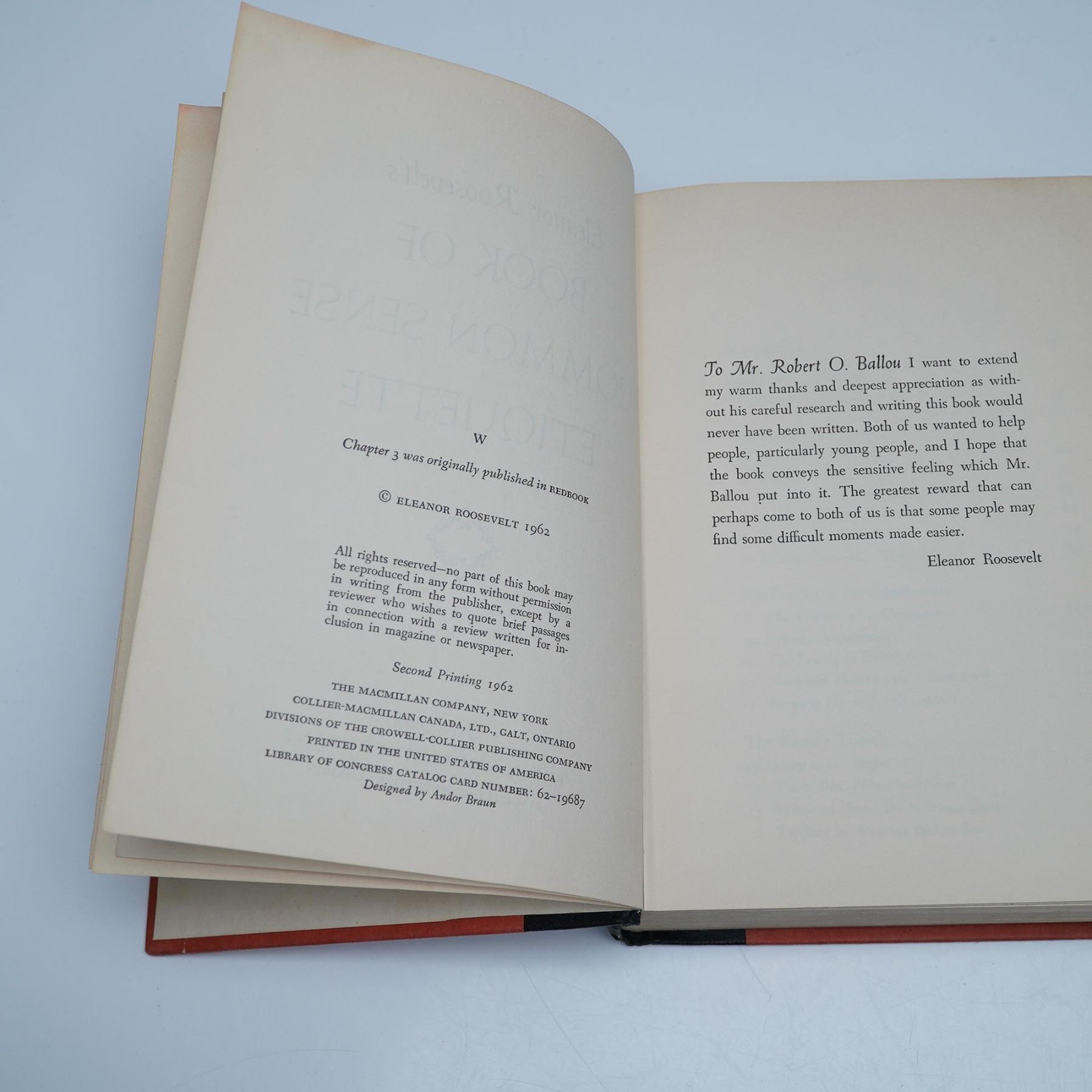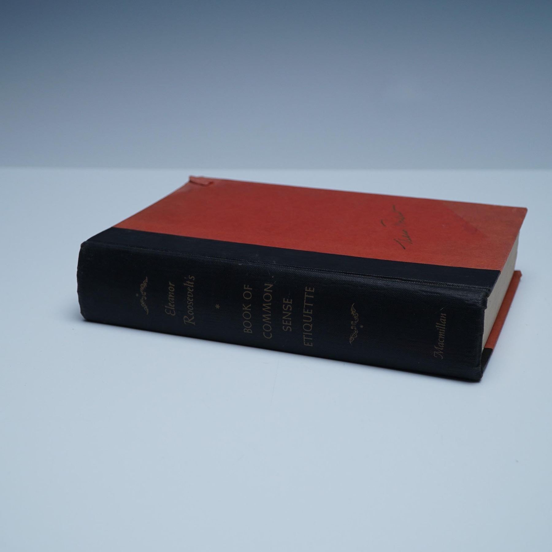 This 1962 second printing of Eleanor Roosevelt's Book of Common Sense Etiquette offers the former First Lady’s insightful guidance on manners, social conduct, and practical advice for navigating everyday interactions. The book, published by The Macmillan Company, features a dedication to Robert O. Ballou, recognizing his contributions to the work. Known for her advocacy for human rights and diplomacy, Roosevelt’s reflections in this book remain relevant and engaging. The hardcover binding showcases black and red cloth boards with gilt lettering on the spine, preserving its vintage appeal. A remarkable addition for collectors of historical literature, presidential memorabilia, or etiquette books.