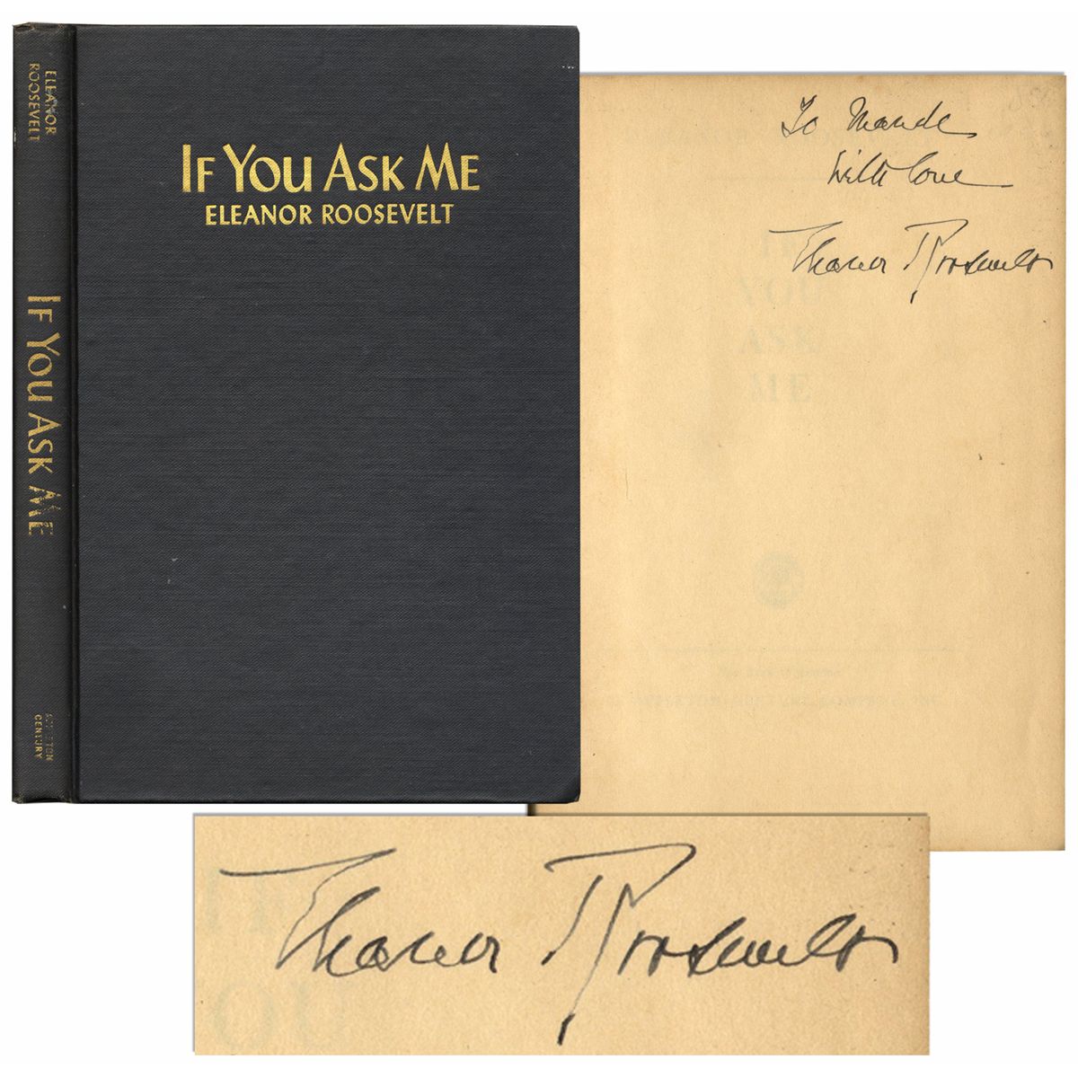 Eleanor Roosevelt signed and inscribed copy of ''If You Ask Me''. A collection of Q and Is from her ''Ladies' Home Journal'' column. Book is D. Appleton-Century Company, Inc.: New York: 1946. Signed on front free endpapers, ''To Maude / With love / Eleanor Roosevelt''. First edition. Bound in black cloth with gilt lettering, book runs 156pp. Minor bumping to corners and toning, else near fine.