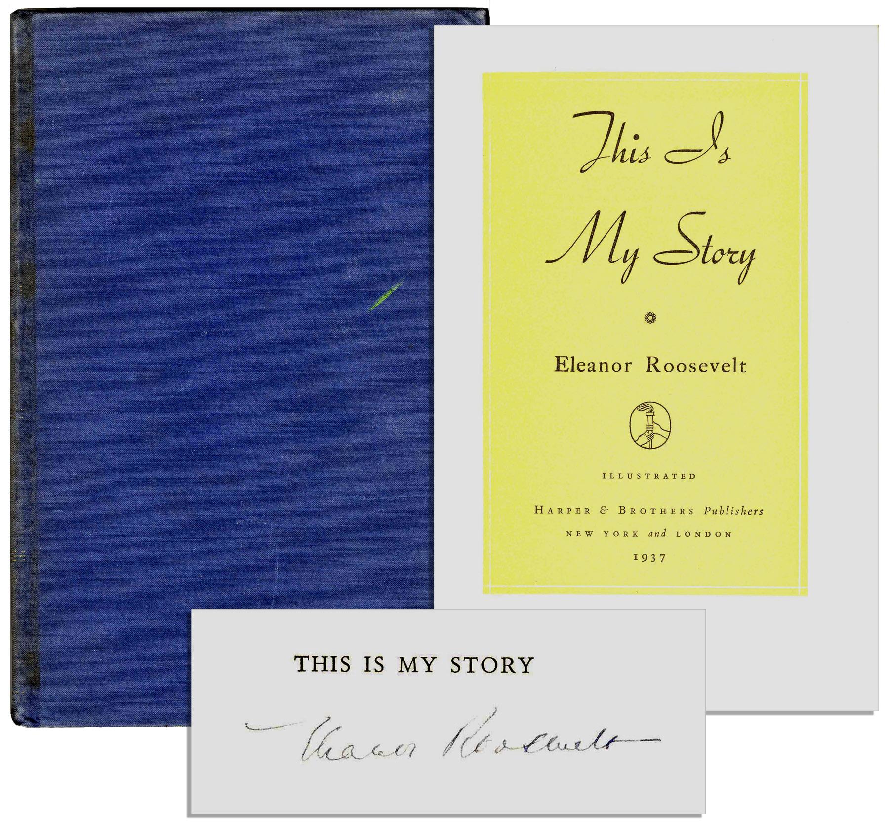 Excellent signed copy of Eleanor Roosevelt's 1937 autobiography, ''This is My Story.'' Signed ''Eleanor Roosevelt'' clearly on title page, book is illustrated with photographs throughout. Harper & Brothers: New York & London: 1937. With ''Tenth Edition'' printed on the copyright page. Book, with no dustjacket, is in its original blue-cloth boards, which have minor wear and fading in spots, particularly on back cover. Internally, book, measuring 6.5'' x 9.5'', has minor toning, though sound with tight binding and clean pages. Near fine.