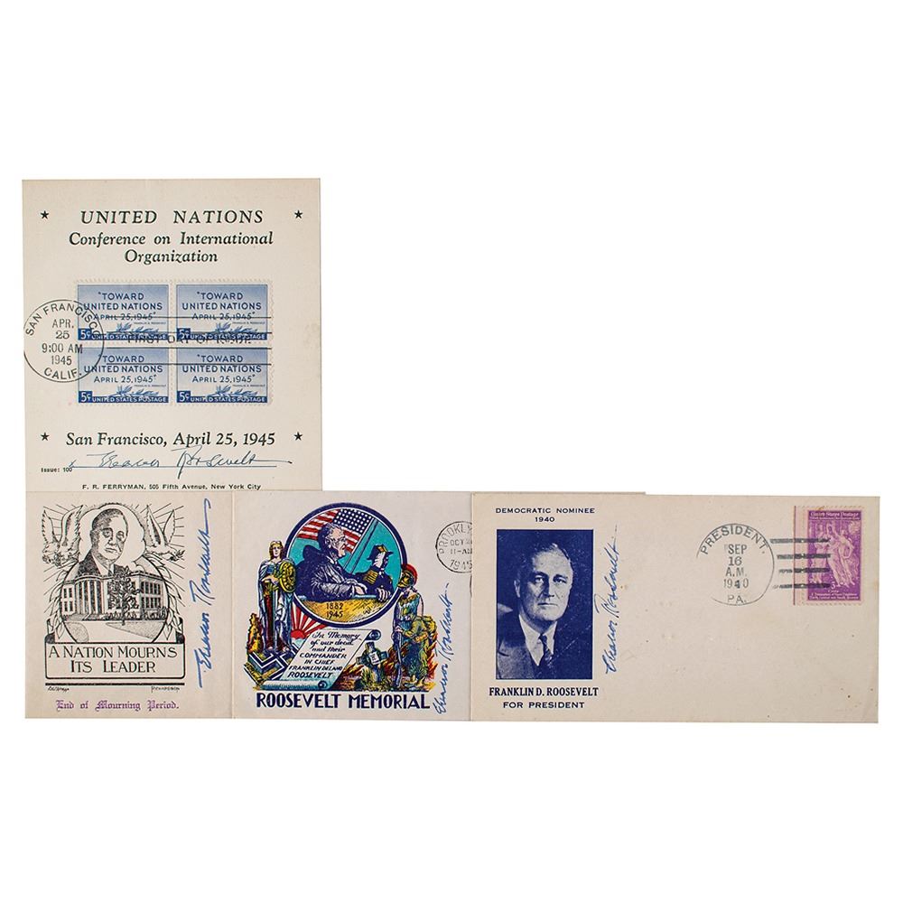 Grouping of four items signed in ink or fountain pen by Eleanor Roosevelt, including: three commemorative covers honoring her husband Franklin D. Roosevelt, and a limited issue FDC sheet with an affixed block of four stamps honoring the United Nations Conference on International Organization. One cover is addressed to Lionel Aucoin of Spencer, Massachusetts. In overall fine condition.