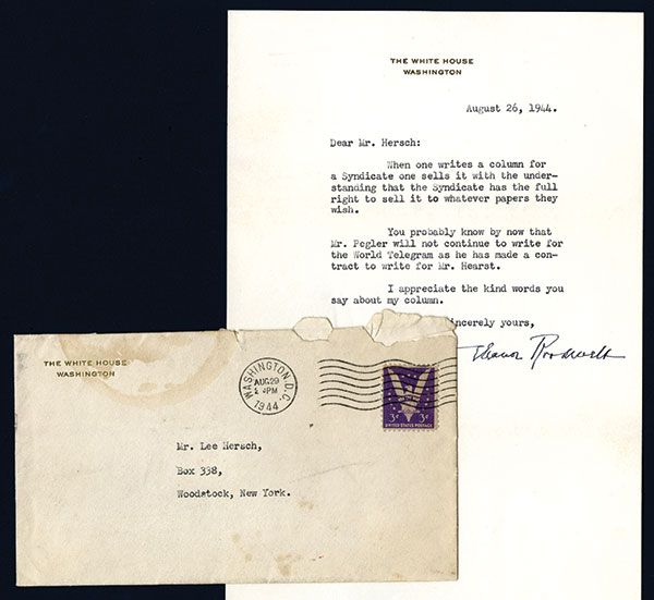 August 26, 1944, Eleanor Roosevelt signed typed letter on White House letterhead, VF condition LS. White House Envelope with postmark and stamp also included, Fine condition. Eleanor Roosevelt (1884-1962) aside from being first lady between 1933 -1945 was also the First Lady of New York (1929-1932), United States Representative to the United Nations Commission on Human Rights (1947-1953), United States Delegate to the United Nations General Assembly (1946-1952), and Chairman of the Presidential Commission on the Status of Women (1961-1962). At her memorial in 1962 Adlai Stevenson asked "What other single human being has touched and transformed the existence of so many?".