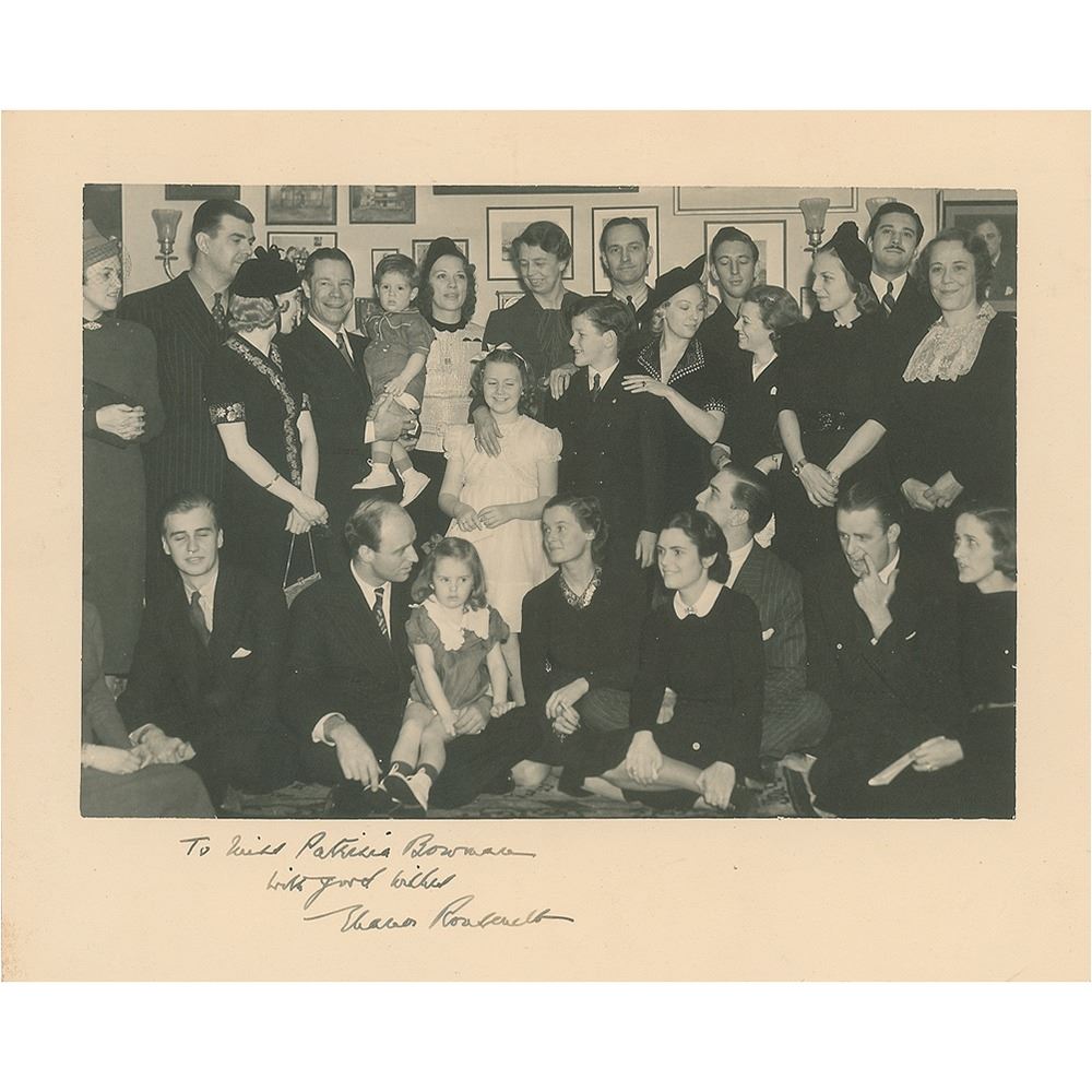 Vintage matte-finish 10 x 8 photo of Roosevelt posing with celebrities including Ray Bolger, Joe E. Brown, Janet Gaynor, Fredric March, and Eleanor Powell at the White House for the 1938 President's Birthday Ball celebration, signed and inscribed in fountain pen to actress Patricia Bowman, "To Miss Patricia Bowman, with good wishes, Eleanor Roosevelt.” In very fine condition.