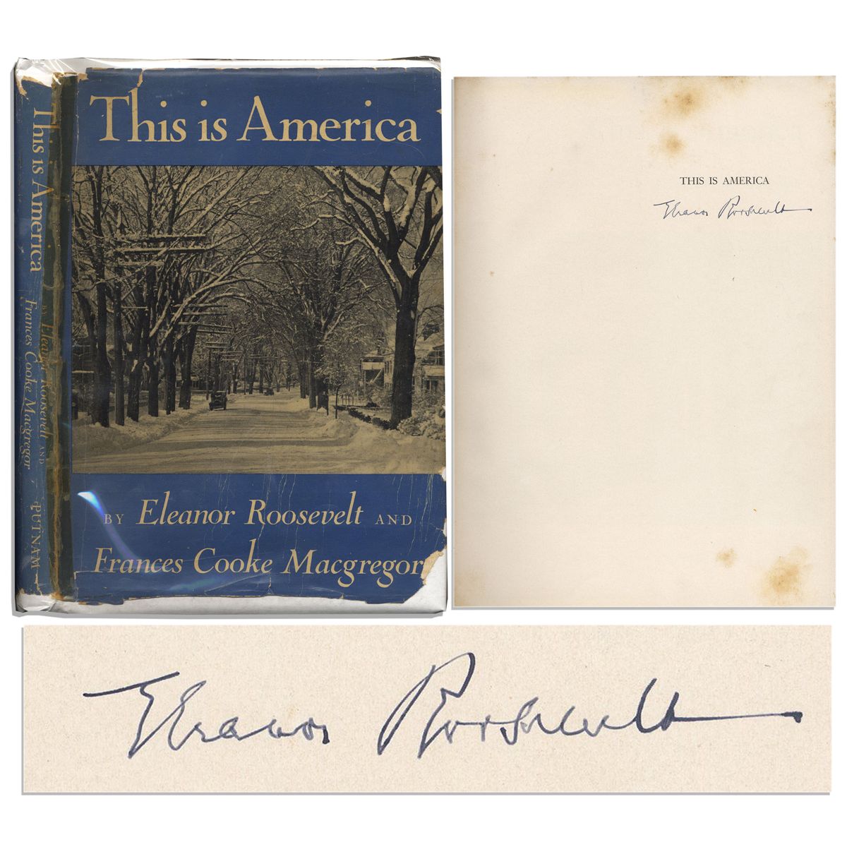 Eleanor Roosevelt signed copy of ''This Is America,'' the photojournalism book which the First Lady captioned. G.P. Putnam's Sons: New York: 1942. An exceptionally scarce title in its original dustjacket, more so signed. Measures 8.25'' x 10.5''. Bound in the publisher's red cloth boards with gilt lettering. Book is in very good condition with some foxing and staining, more so on endpapers. Price clipped dustjacket is chipped with some paper loss; good condition. The only signed copy by Eleanor Roosevelt on the market.