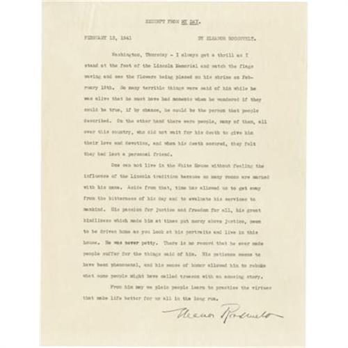 <B>Eleanor Roosevelt Typed Document Signed,</B></I> 8” x 10.5”, typewritten copy for Mrs. Roosevelt’s “My Day” syndicated newspaper column, February 13, 1941, Washington. Signed lower right in ink. Included is the White House transmittal letter and envelope. Very fine. <I>From the collection of Henry E. Luhrs.</B></I><I><BR></B></I><BR><BR><b>Shipping:</b> Flat Material, Small (<a target="_blank" href="http://www.heritageauctions.com/common/shipping.php">view shipping information</a>)