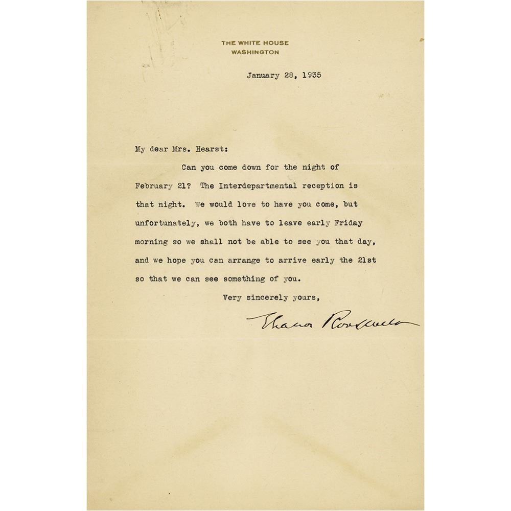 TLS as first lady, one page, 6 x 9.25, White House letterhead, January 28, 1935. Letter to Millicent Hearst, the wife of media tycoon William Randolph Hearst, in full: "Can you come down for the night of February 21? The Interdepartmental reception is that night. We would love to have you come, but unfortunately, we both have to leave early Friday morning so we shall not be able to see you that day, and we hope you can arrange to arrive early the 21st so that we can see something of you." In fine condition, with paperclip impressions to the upper left corner, and light seal-related toning to the bottom blank area. Accompanied by the original White House mailing envelope.