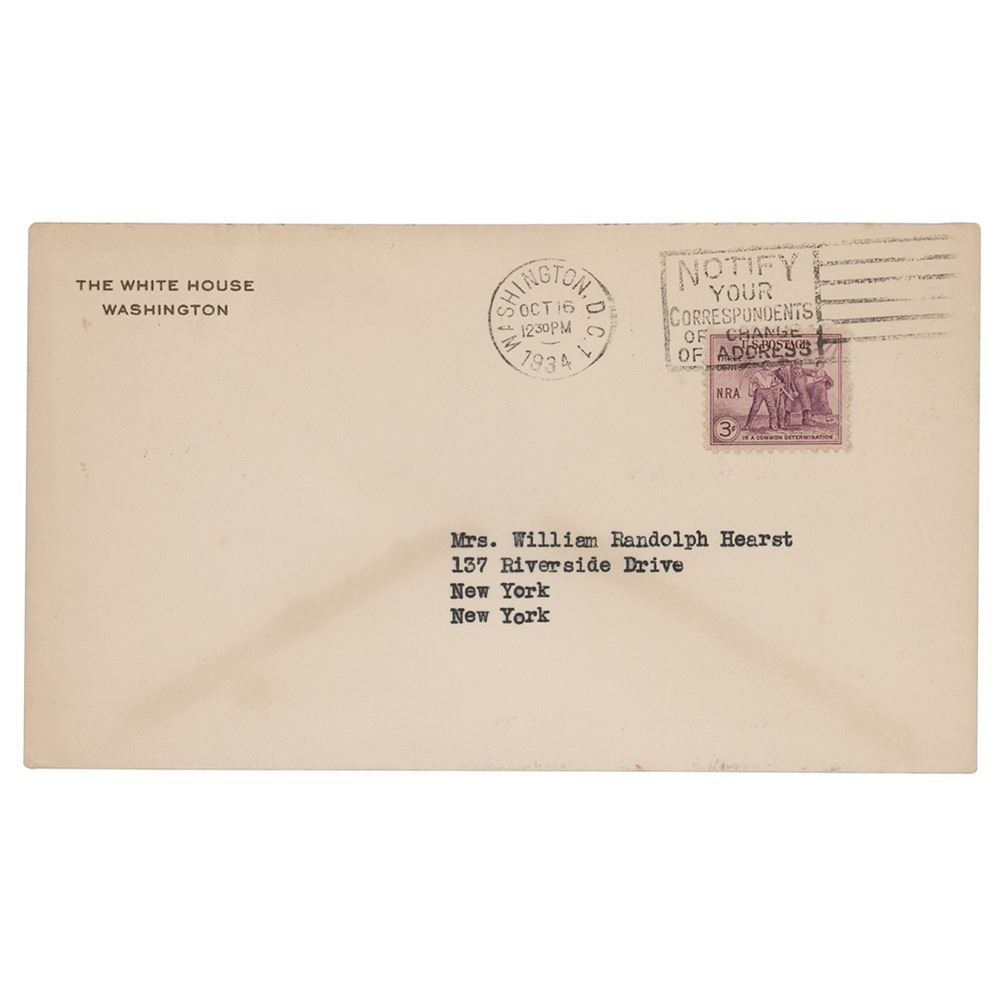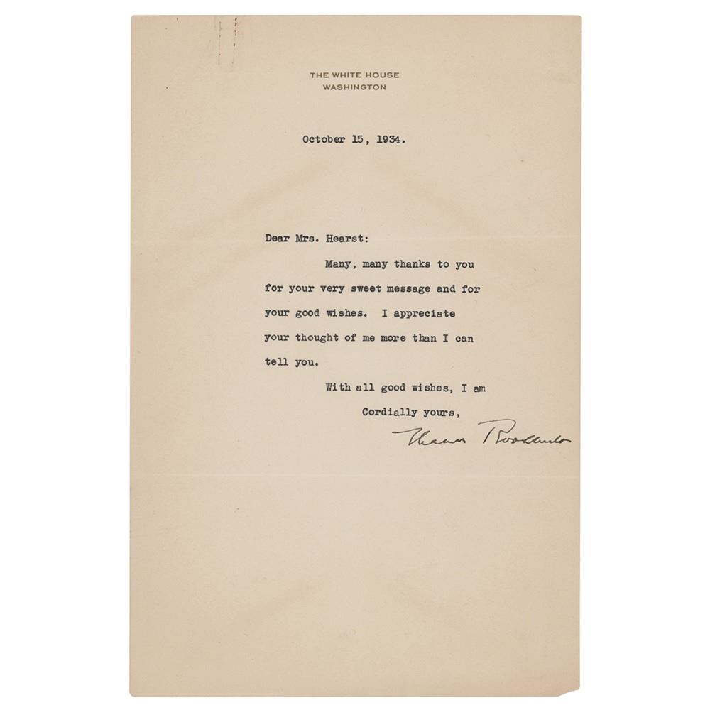 TLS as first lady, one page, 6.25 x 9.25, White House letterhead, October 15, 1934. Letter to Millicent Hearst, the wife of media tycoon William Randolph Hearst, in full: "Many, many thanks to you for your very sweet message and for your good wishes. I appreciate your thought of me more than I can tell you." In fine condition, with a rusty paperclip impression to the top edge. Accompanied by the original White House mailing envelope.