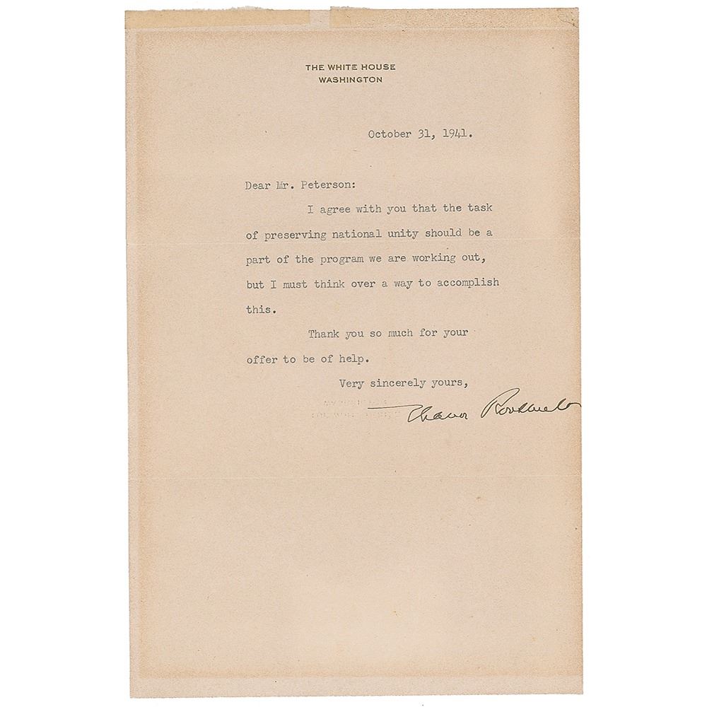 TLS, one page, 6 x 9.25, White House letterhead, October 31, 1941. Letter to Frank Peterson, deputy mayor of Los Angeles, in full: "I agree with you that the task of preserving national unity should be a part of the program we are working out, but I must think over a way to accomplish it." In fine condition, with old tape residue to the top edge, and light toning from prior display. Accompanied by the original mailing envelope.