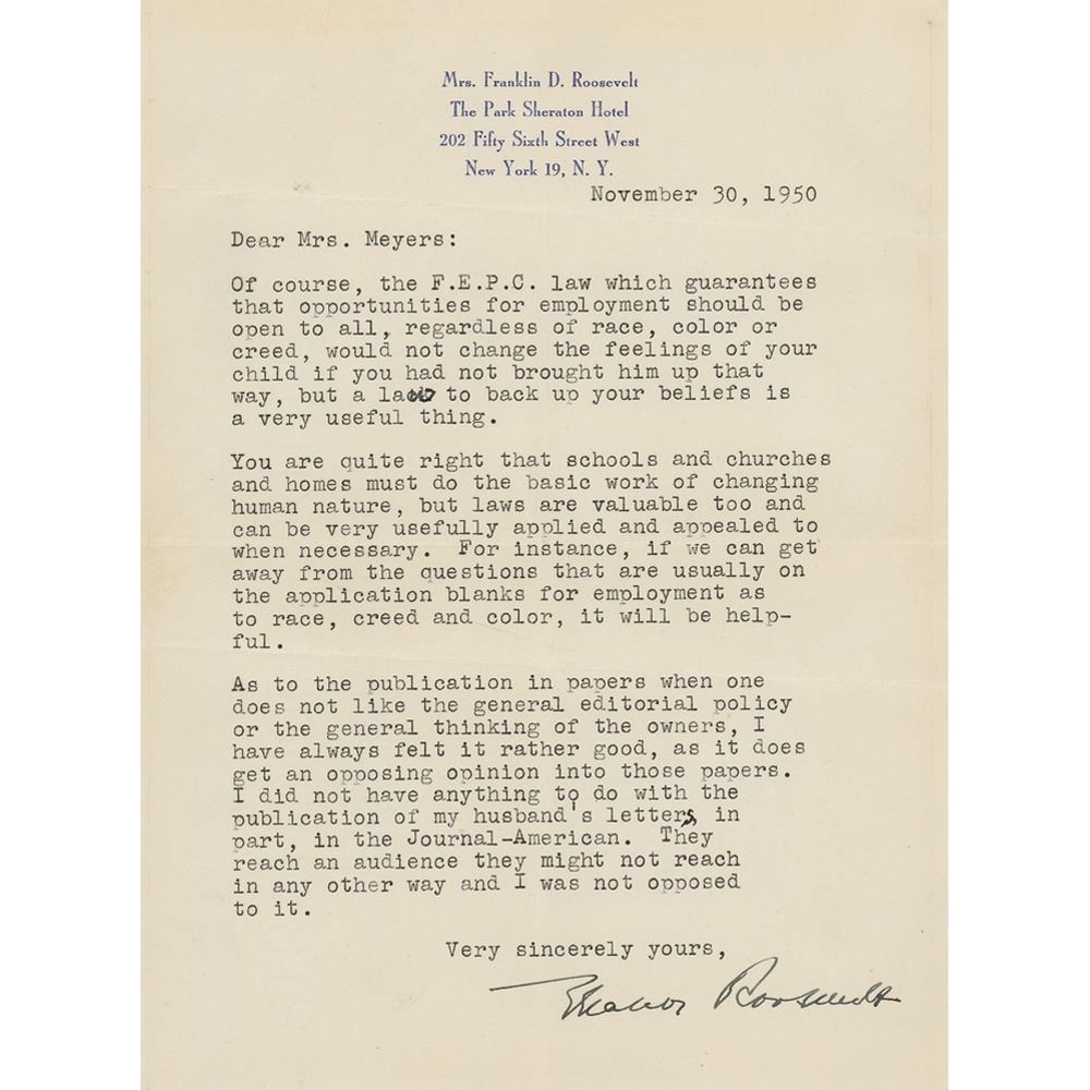 TLS, one page, 6 x 8.25, personal letterhead, November 30, 1950. Letter to Mrs. Meyers on equality, in part: "Of course, the F.E.P.C. law which guarantees that opportunities for employment should be open to all, regardless of race, color or creed, would not change the feelings of your child if you had not brought him up that way, but a law to back up your beliefs is a very useful thing. You are quite right that schools and churches and homes must do the basic work of changing human nature, but laws are valuable too and can be very usefully applied and appealed to when necessary. For instance, if we can get away from the questions that are usually on the application blanks for employment as to race, creed and color, it will be helpful." In fine condition, with two extra horizontal folds.