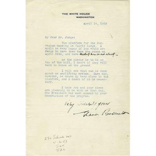 <B>Eleanor Roosevelt Typed Letter Signed</B></I> “<I>Very Sincerely yours, Eleanor Roosevelt</B></I>”. One page, 6.25” x 9.25”, on White House letterhead, Washington, April 14, 1939, to a Mr. Junge. This letter concerns the planning of events for an upcoming picnic featuring Norwegian dancing. In the letter Mrs. Roosevelt goes over several last minute preparations including getting a piano tuned and acquiring an amplifying system. Fine condition. <I>From the collection of Henry E. Luhrs.</B></I><BR><BR><b>Shipping:</b> Flat Material, Small (<a target="_blank" href="http://www.heritageauctions.com/common/shipping.php">view shipping information</a>)