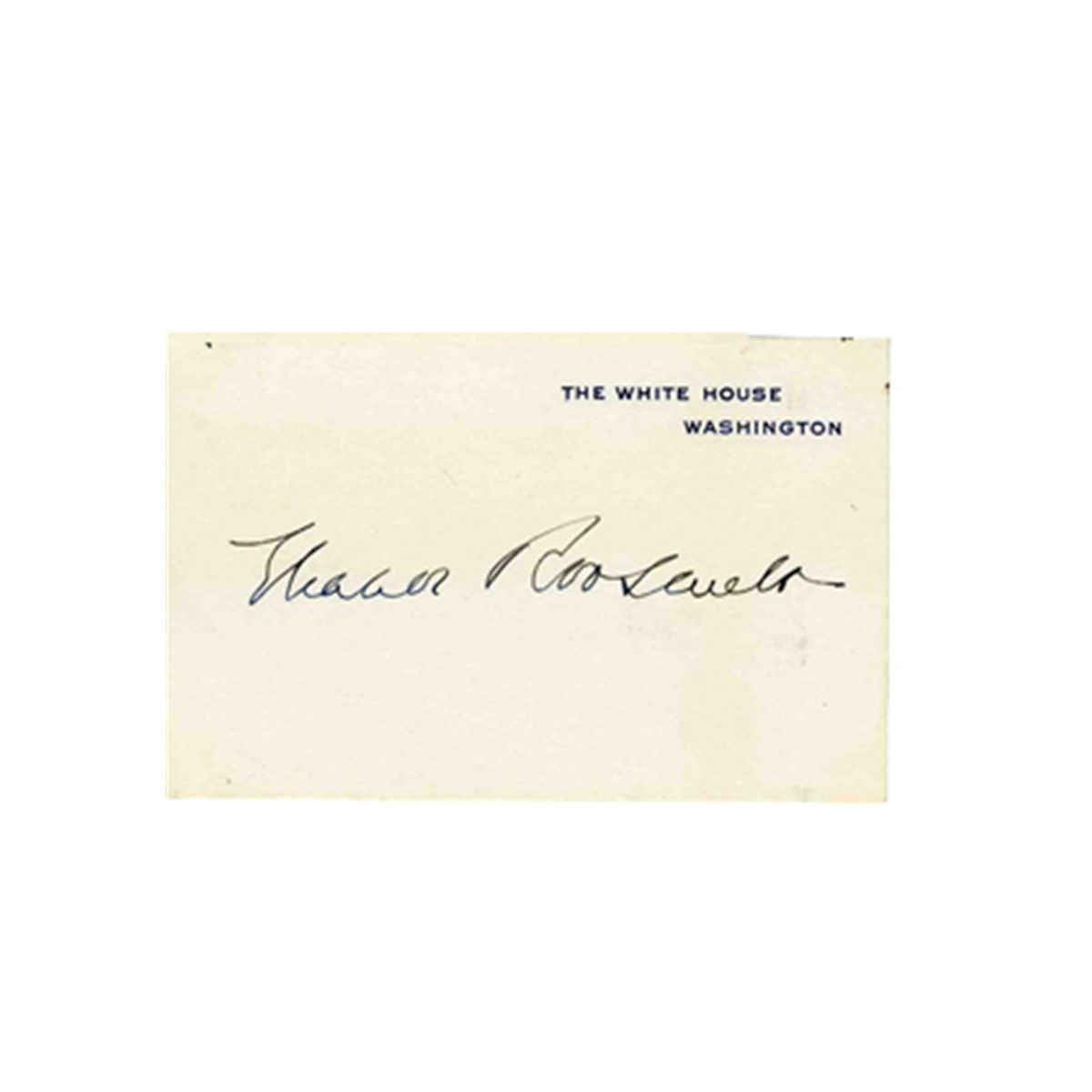 White House card signed by Eleanor Roosevelt. Official White House card measures 4'' x 2.5'' and reads, ''The White House / Washington'' in blue print. Signed ''Eleanor Roosevelt'' in faded black ink. The card was sent to Avalon Benson for her scrapbook and is accompanied by a letter of provenance to Benson -- a little girl diagnosed with rheumatic fever and a potentially fatal heart condition. A few minor ink smudges near the top of the card, otherwise excellent condition with virtually no age wear.