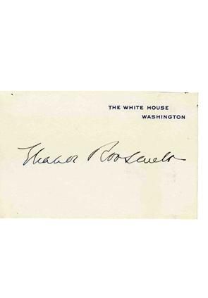 White House card signed by Eleanor Roosevelt. Official White House card measures 4” x 2.5” and reads, “The White House / Washington,” in blue print. Signed “Eleanor Roosevelt” in faded black ink. The card was sent to Avalon Benson for her scrapbook and is accompanied by a letter of provenance to Benson -- a little girl diagnosed with rheumatic fever and a potentially fatal heart condition. A few minor ink smudges near the top of the card, otherwise excellent condition with virtually no age wear.