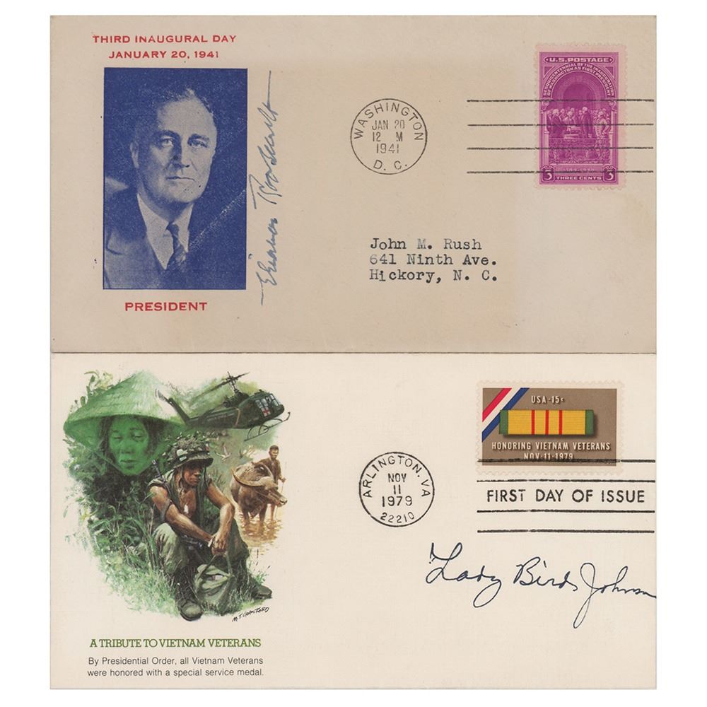 Two commemorative covers: one with a cachet honoring FDR's third inauguration, signed vertically in fountain pen by Eleanor Roosevelt; and one with a cachet honoring Vietnam veterans, signed in black felt tip by Lady Bird Johnson. In overall fine condition.