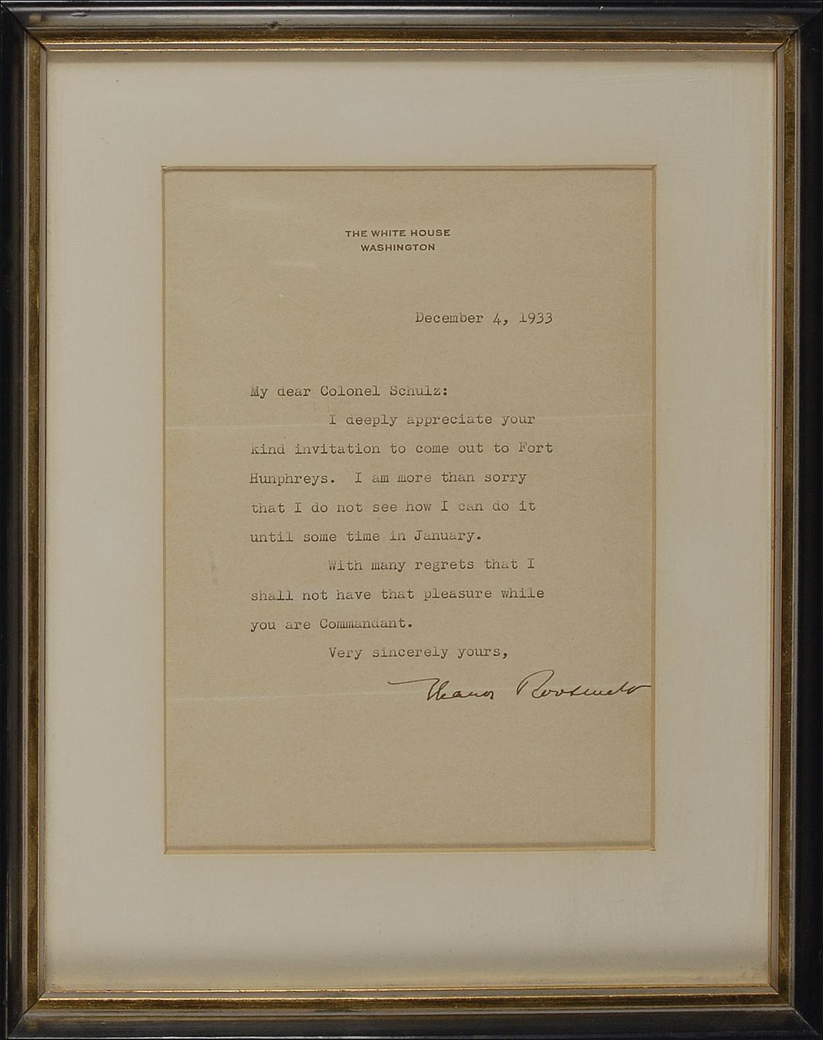 TLS, one page, 5.5 x 8, White House letterhead, December 4, 1933. Letter to Colonel Schulz declining an invitation. In full: “I deeply appreciate your kind invitation to come out to Fort Humphreys. I am more than sorry that I do not see how I can do it until some time in January. With many regrets that I shall not have the pleasure while you are Commandant.” Matted and framed to an overall size of 9.5 x 12. In fine condition, with uniform mild toning, and a horizontal mailing fold through signature.
