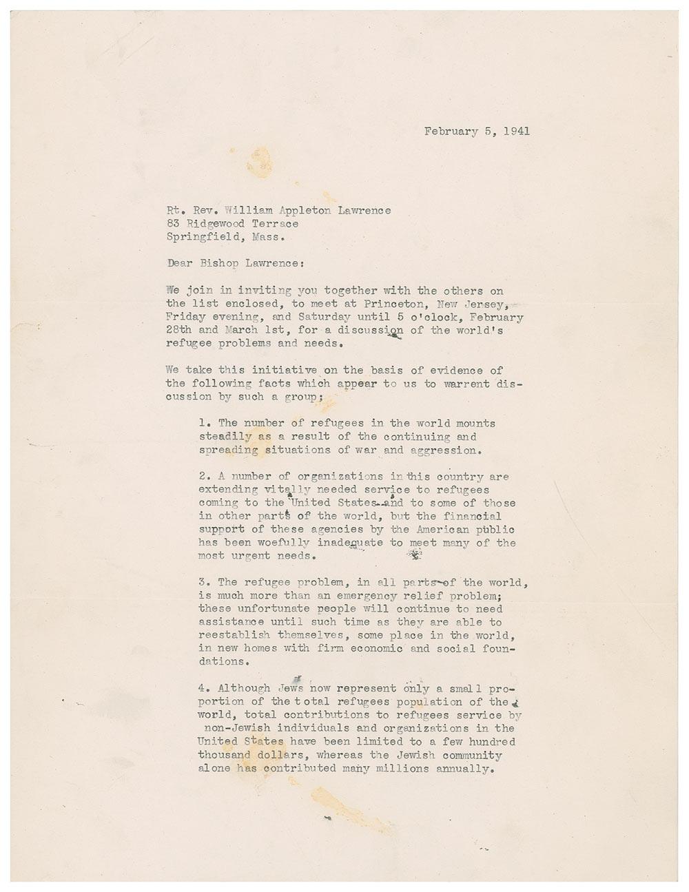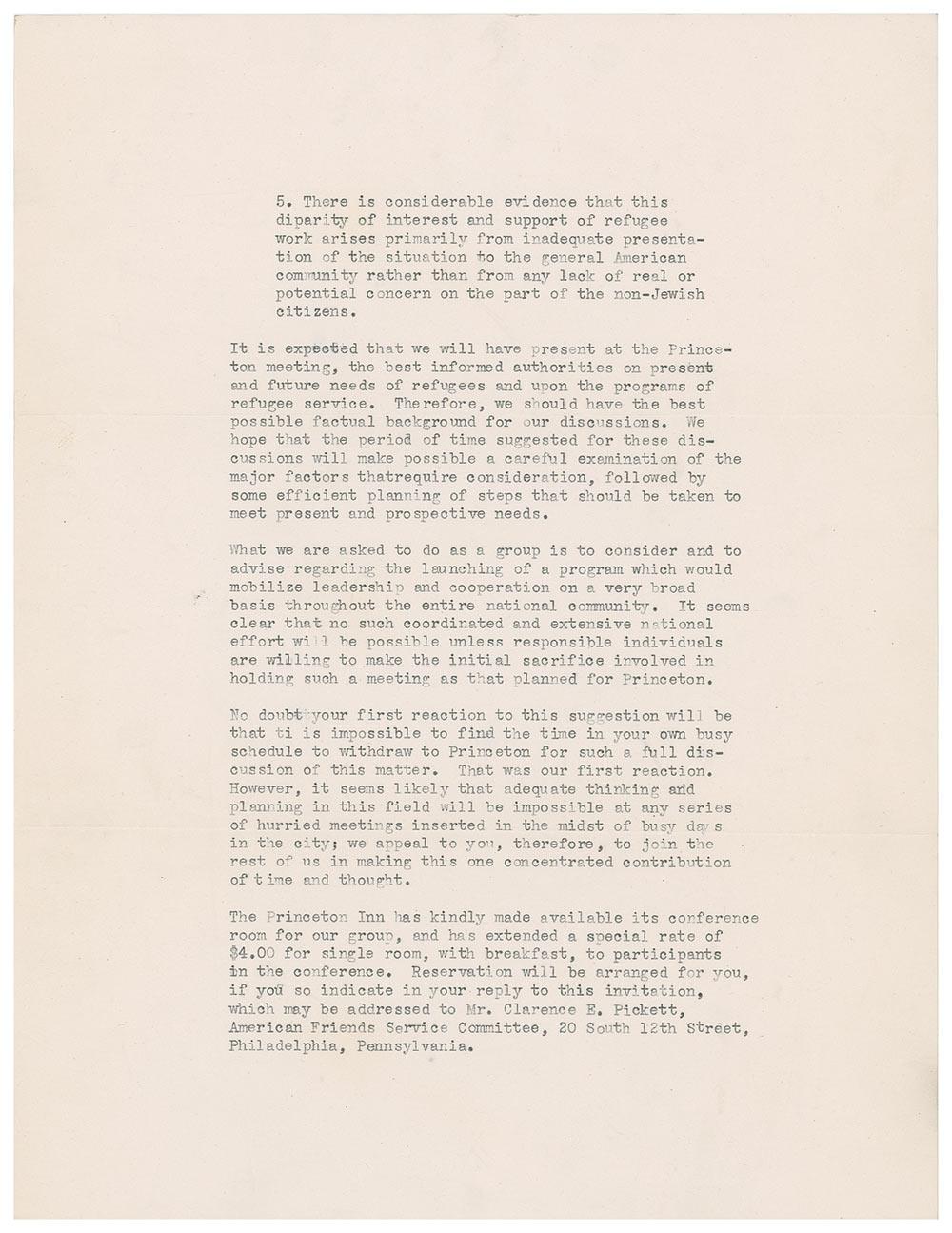 It is expected that we will have present at the Princeton meeting, the best informed authorities on present and future needs of refugees and upon the programs of refugee service…What we are asked to do as a group is to consider and to advise regarding the launching of a program which would mobilize leadership and cooperation on a very broad basis throughout the entire national community.”