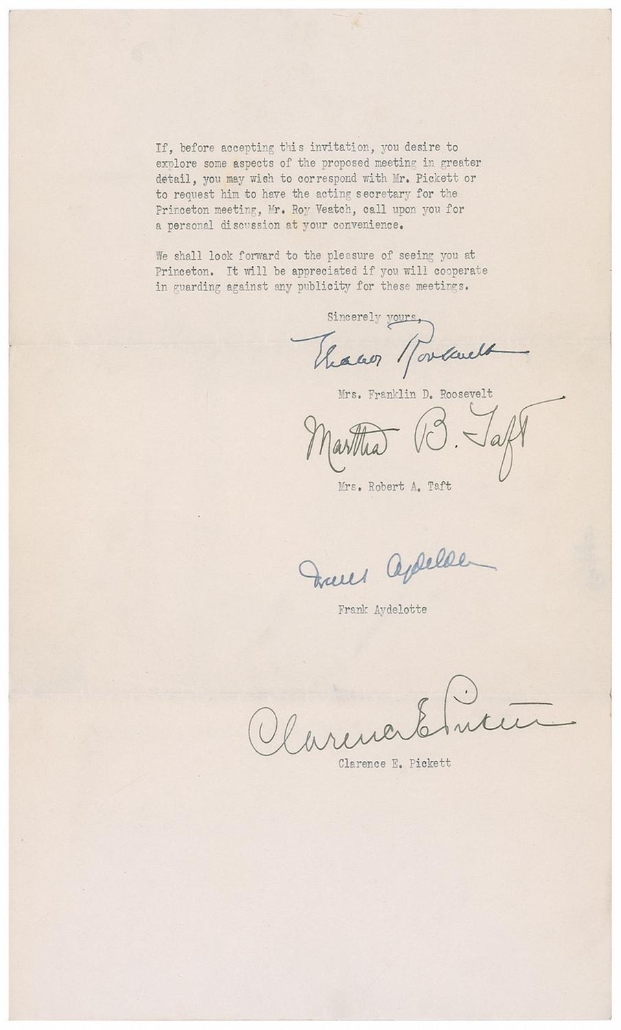 Historically relevant TLS, three pages, 8.5 x 11, February 8, 1941. Signed on the last page by Mrs. Roosevelt as well as by Martha B. Taft, Frank Aydelotte, and Clarence E. Pickett. Roosevelt contacts the Right Reverend William Appleton Lawrence in Springfield, Massachusetts. In part: “We join in inviting you together with the others on the list enclosed, to meet at Princeton, New Jersey, Friday evening, and Saturday until 5 o’clock, February 28th and March 1st, for a discussion of the world’s refugee problems and needs.
