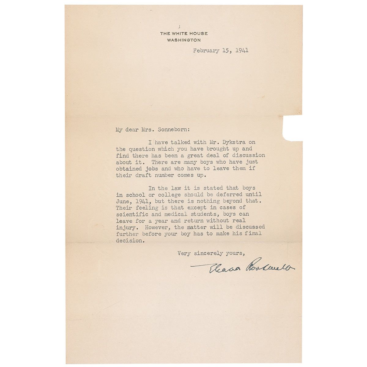 TLS, one page, 6 x 9.25, White House letterhead, February 15, 1941. Letter to a woman concerning her son and the military draft. In part: “There are many boys who have just obtained jobs and who have to leave them if their draft number comes up. In the law it is stated that boys in school or college should be deferred until June, 1941, but there is nothing beyond that. Their feeling is that except in the cases of scientific and medical students, boys can leave for a year and return without real injury.” In very good condition, with scattered toning, a few small separations along horizontal folds, and paper loss to right edge.