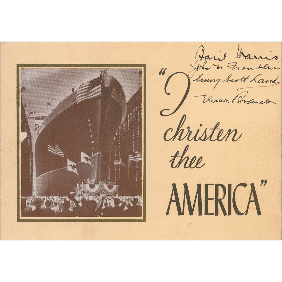 Commemorative booklet, 8.5 x 6, for the christening of the ship America, on August 31, 1939, in Newport News, Virginia. Inside bears a color portrait of the ship, with the back cover giving the particular details of the vessel. Signed on the cover in fountain pen by Eleanor Roosevelt, and also signed by Emory Scott Land, John M. Franklin, and Basil Harris. In fine condition.