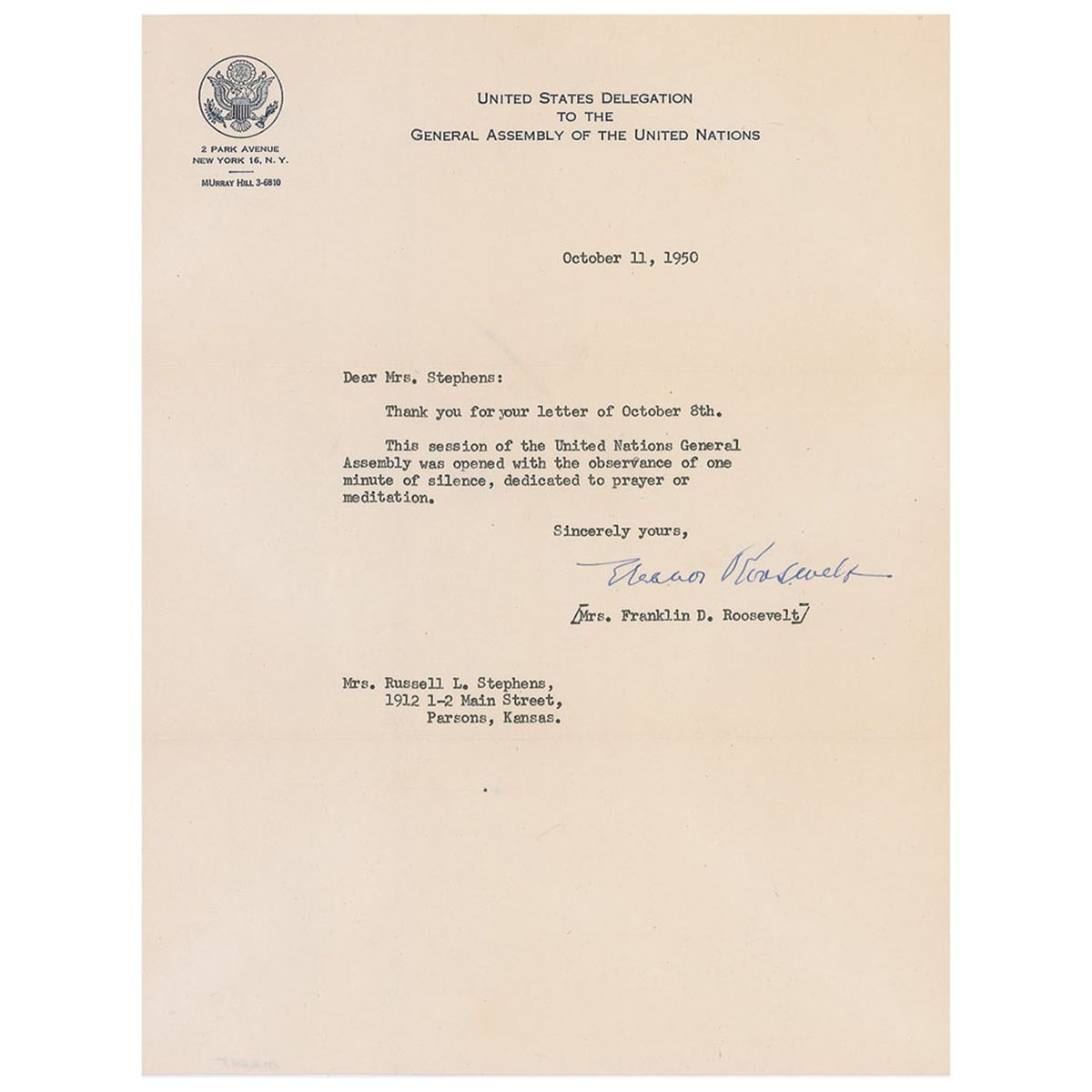 TLS, one page, 8 x 10.5, United Nations letterhead, October 11, 1950. Roosevelt writes to Mrs. Russell L. Stephens in Parsons, Kansas. In part: “This session of the United Nations General Assembly was opened with the observance of one minute of silence, dedicated to prayer or meditation.” Accompanied by the original mailing envelope. In fine condition.