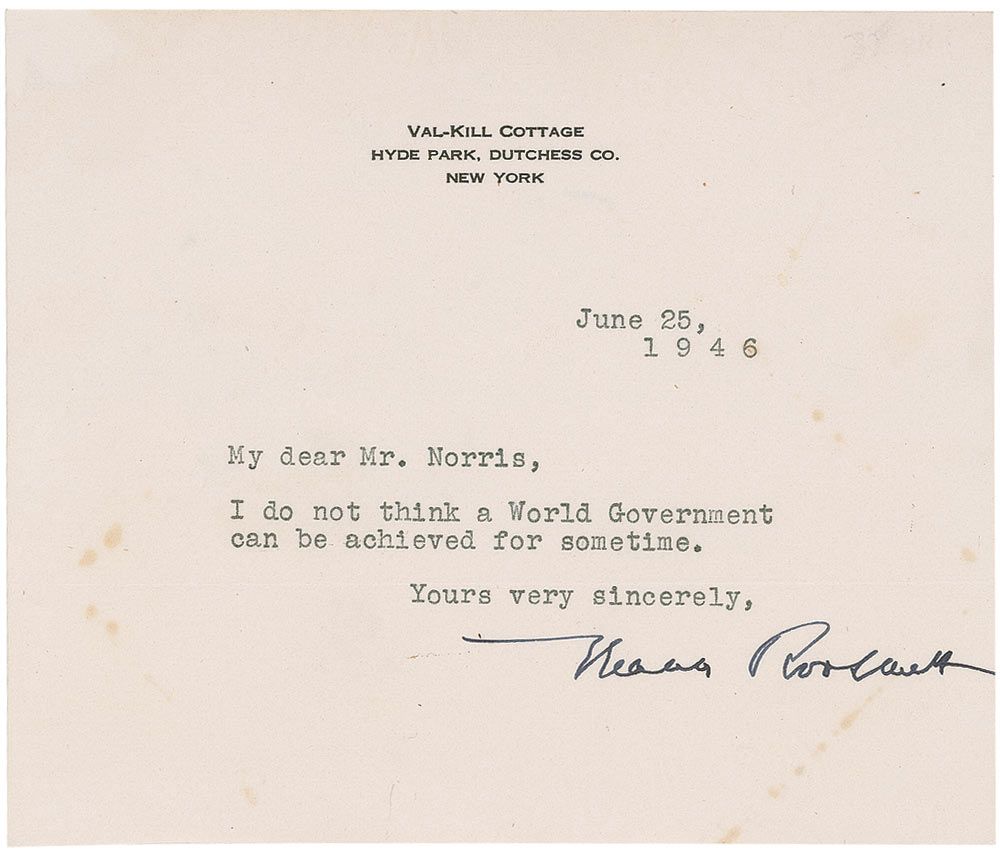 TLS, one page, 6 x 5, Val-Kill Cottage letterhead, June 25, 1946. Brief note to Mr. G. D. Norris. In full: “I do not think a World Government can be achieved for sometime.” Trimmed bottom edge and a bit of scattered light toning, otherwise fine condition. Accompanied by the original mailing envelope.