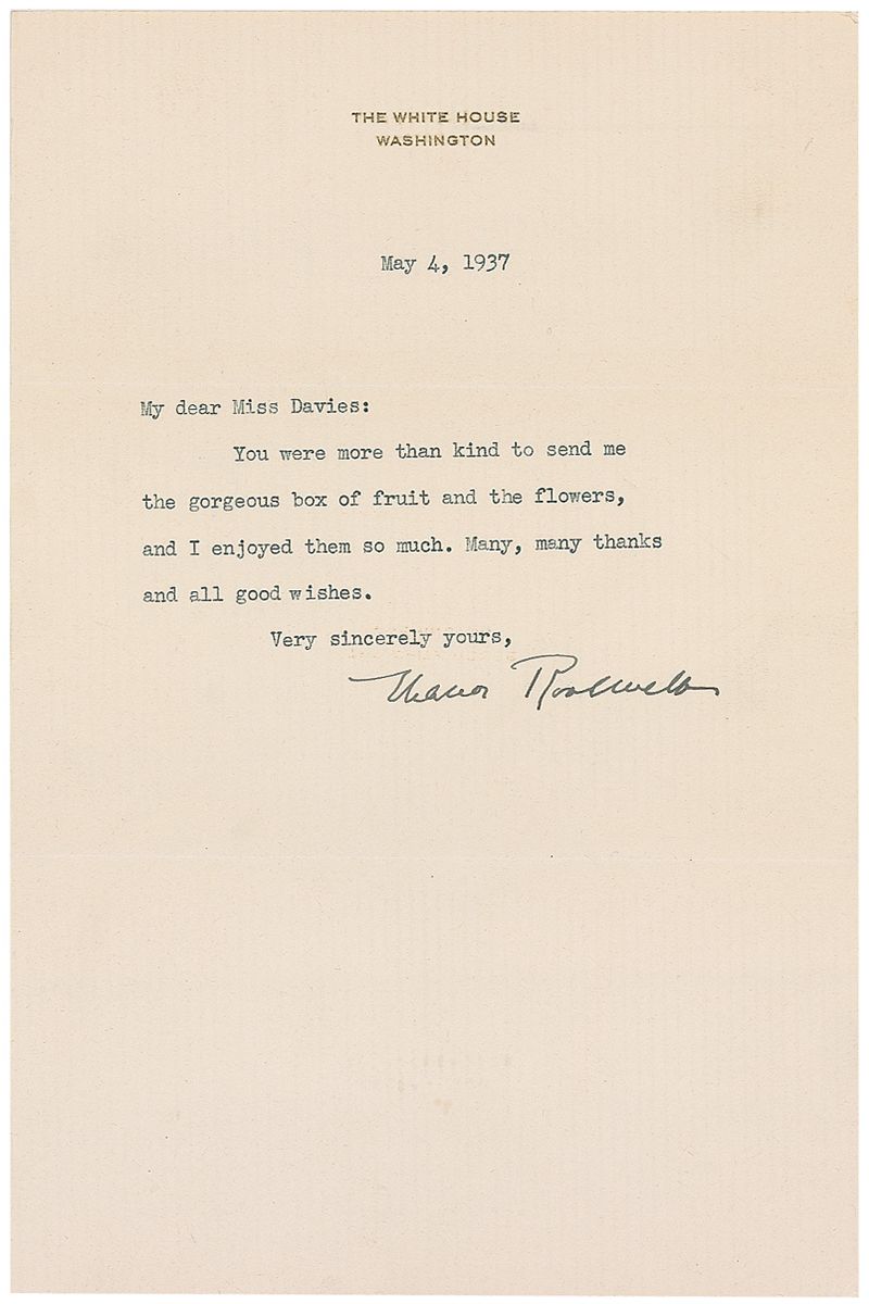TLS, one page, 6 x 9.25, White House letterhead, May 4, 1937. Short letter to Marion Davies. In full: “You were more than kind to send me the gorgeous box of fruit and the flowers, and I enjoyed them so much. Many, many thanks and good wishes.” In fine condition, with light vertical toning from magnetic album.