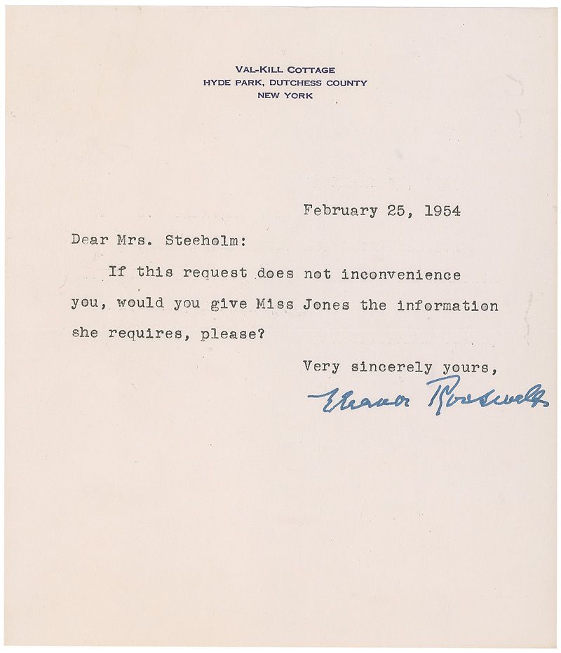 TLS, one page, 6 x 7, Val-Kill Cottage letterhead, February 25, 1954. A letter to Mrs. Steeholm. In full: “If this request does not inconvenience you, would you give Miss Jones the information she requires, please?” In fine condition, with a paperclip impression to the top, a central vertical crease, and scattered light wrinkling.