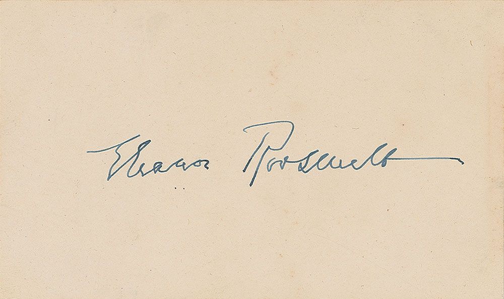 Vintage fountain pen signature, “Eleanor Roosevelt,” on an off-white 5 x 3 card. Mild scattered foxing and toning, and a paperclip impression to the upper border, otherwise fine condition.