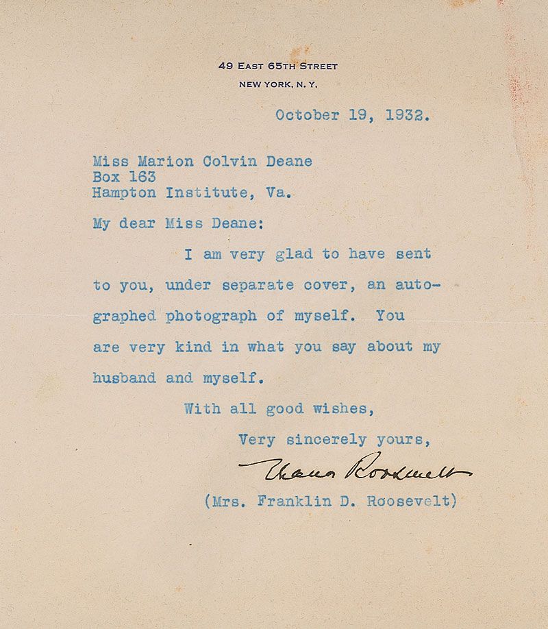 TLS, one page, 6 x 7, personal letterhead, October 19, 1932. Letter to a young collector. In full: “I am very glad to have sent to you, under separate cover, an autographed photograph of myself. You are very kind in what you say about my husband and myself.” In fine condition, with some scattered light toning to upper blank portion.